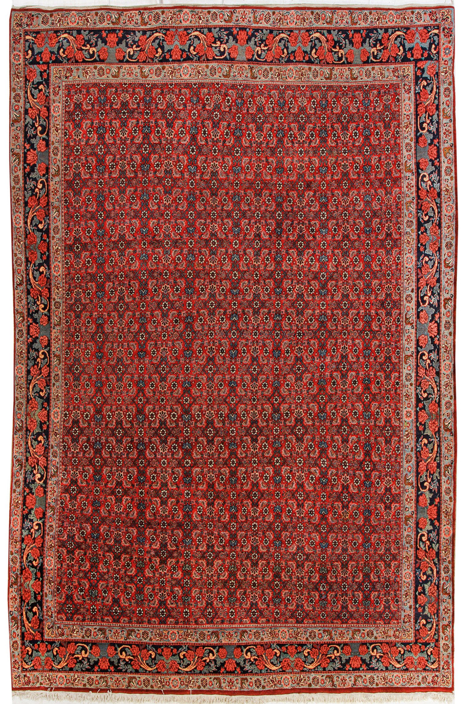 Persien. Mitte 20. Jh.; Wolle auf Baumwolle. Im roten Innenfeld flächendeckend dichte Herati-Musterung. Umlaufend dunkelgrundige Rosenbordüre, flankiert von hellblauen Nebenbordüren. 221 cm x 325 cm.