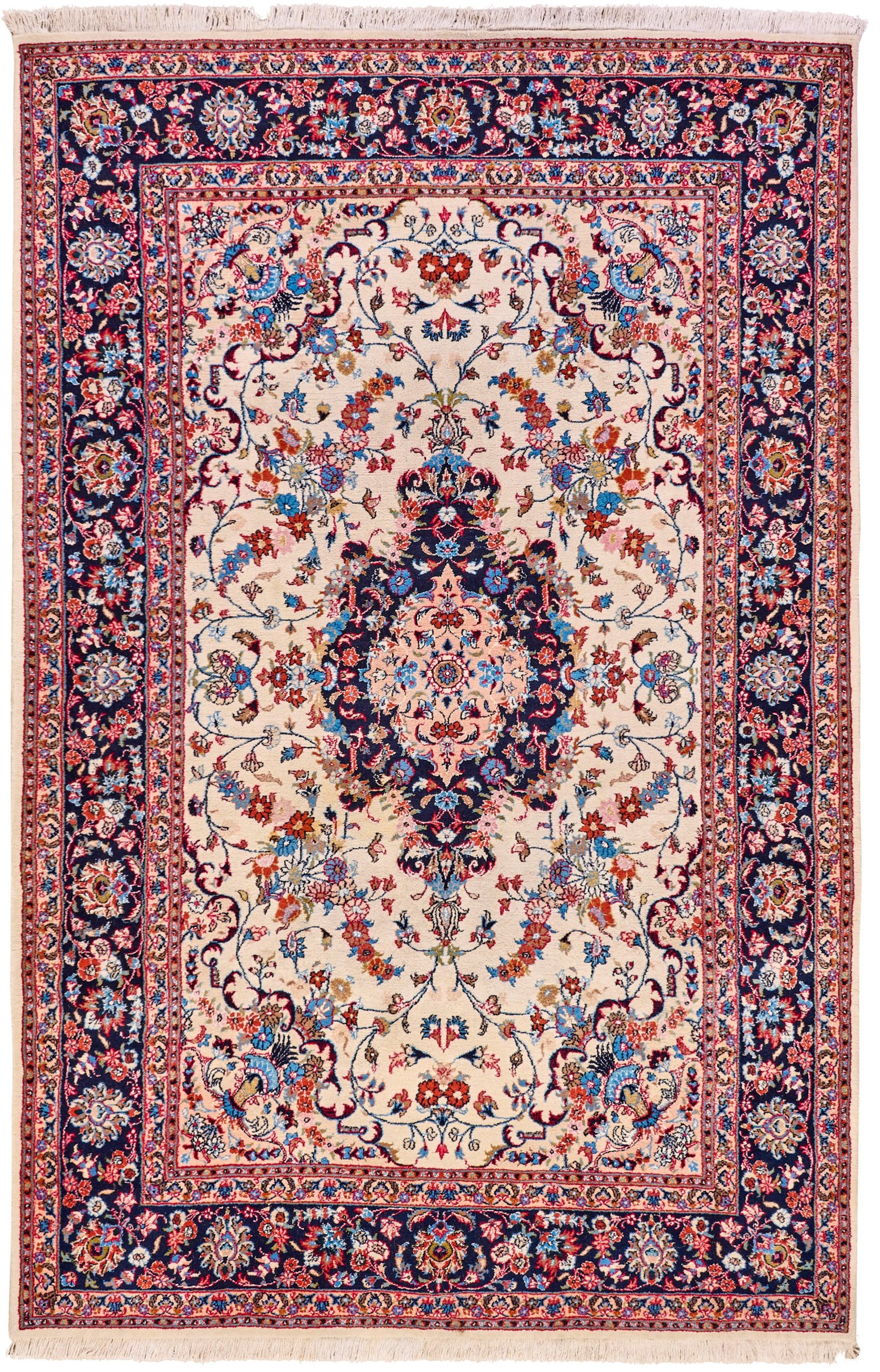 Wolle auf Baumwolle. Im elfenbeinfarbenen Innenfeld dunkelgrundiges Zentralmedaillon sowie passig geschweifte Ecklösungen. Flächendeckende Musterung aus üppigen Blütenrispen. Umlaufend breite, dunkelgrundige Palmettenbordüre, flankiert von schmalen Bändern. 206 cm x 310 cm.