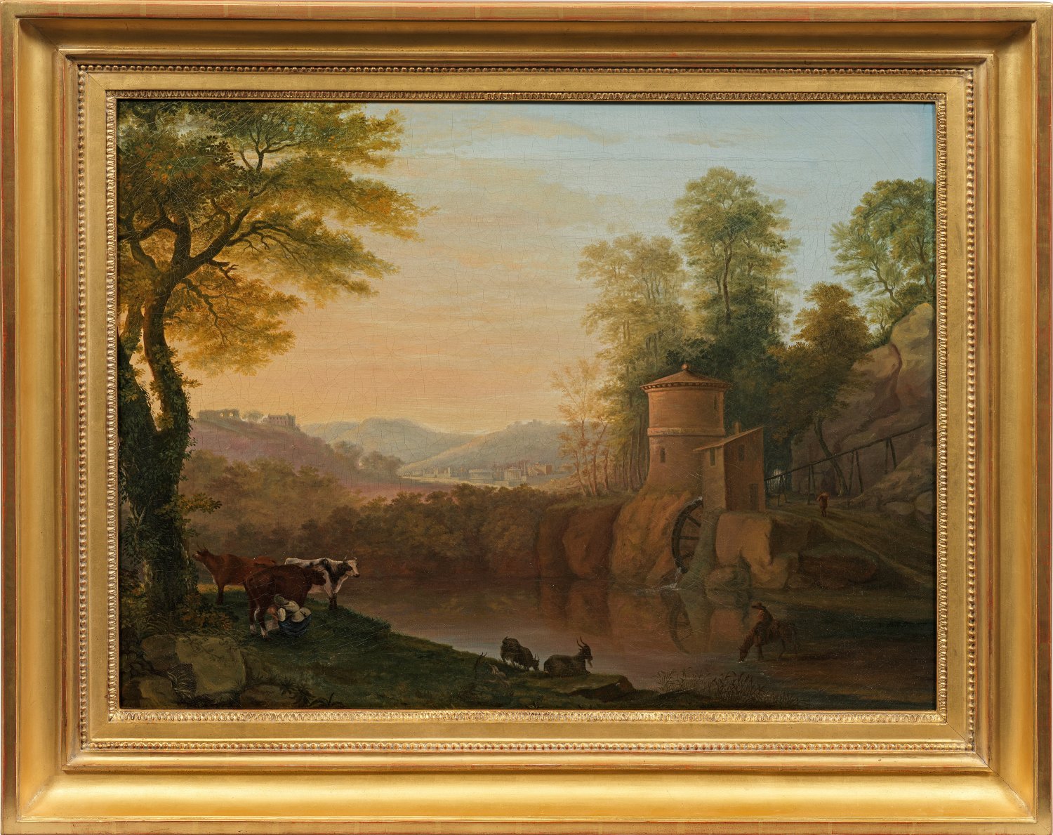 Die atmosphärische, fein lasierend gemalte gestimmte Landschaft im warmen, goldenen Abendlicht wird im Vordergrund durch rastende Figuren belebt, die sich am Teich der Wassermühle versammelt haben: unter einem hohen Baum links eine Hirtin mit Ziegen und Kühen, von denen sie eine melkt, auf der rechten Bildseite ein Reiter, der sein Pferd seinen Durst löschen lässt. Im Mittelgrund dahinter die pittoreske Wassermühle mit rundem Turm, flankiert von einem baumbestandenen Felsenhang. Der weite, tiefe Blick führt auf eine bergige Landschaft mit fantasiereicher, antiker Architektur. In mehrfacher Hinsicht gehen nicht nur die Bildstruktur, sondern auch die Motive auf Werke Claude Lorrains zurück: Die Komposition und das Motiv der Wassermühle basieren auf einem bekannten Gemälde Lorrains von 1631, dass sich heute im Museum of Fine Arts in Boston, Massachusetts befindet sowie auf einer Radierung Lorrains von 1634. Zu den Künstlern, welche sich diese zum Vorbild nahmen, gehörte u. a. der Niederländer Jan Hackaert (1629 bis nach 1685), wie eine Zeichnung in der Hamburger Kunsthalle belegt (Inv.-Nr.: 22006). Öl/Lwd., doubl.; 60,5 cm x 79 cm. Rahmen.
