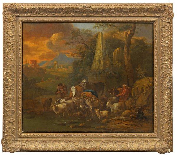 Blick auf eine atmosphärisch gestimmte südliche Landschaft mit antiken Ruinen im Abendlicht. In Motiv, Komposition und Stil charakteristisches Werk des auf italienisierende arkadische Landschaften mit Hirtenstaffage spezialisierten Künstlers, der durch Nicolaes Berchem beeinflusst wurde. Außer in Holland und England war Carrée 1697-1713 in Berlin tätig, wo er Hofmaler König Friedrich I. war. Öl/Lwd., doubl.; R. u. sign. u. dat. 1692. 53 cm x 62,5 cm. Rahmen.