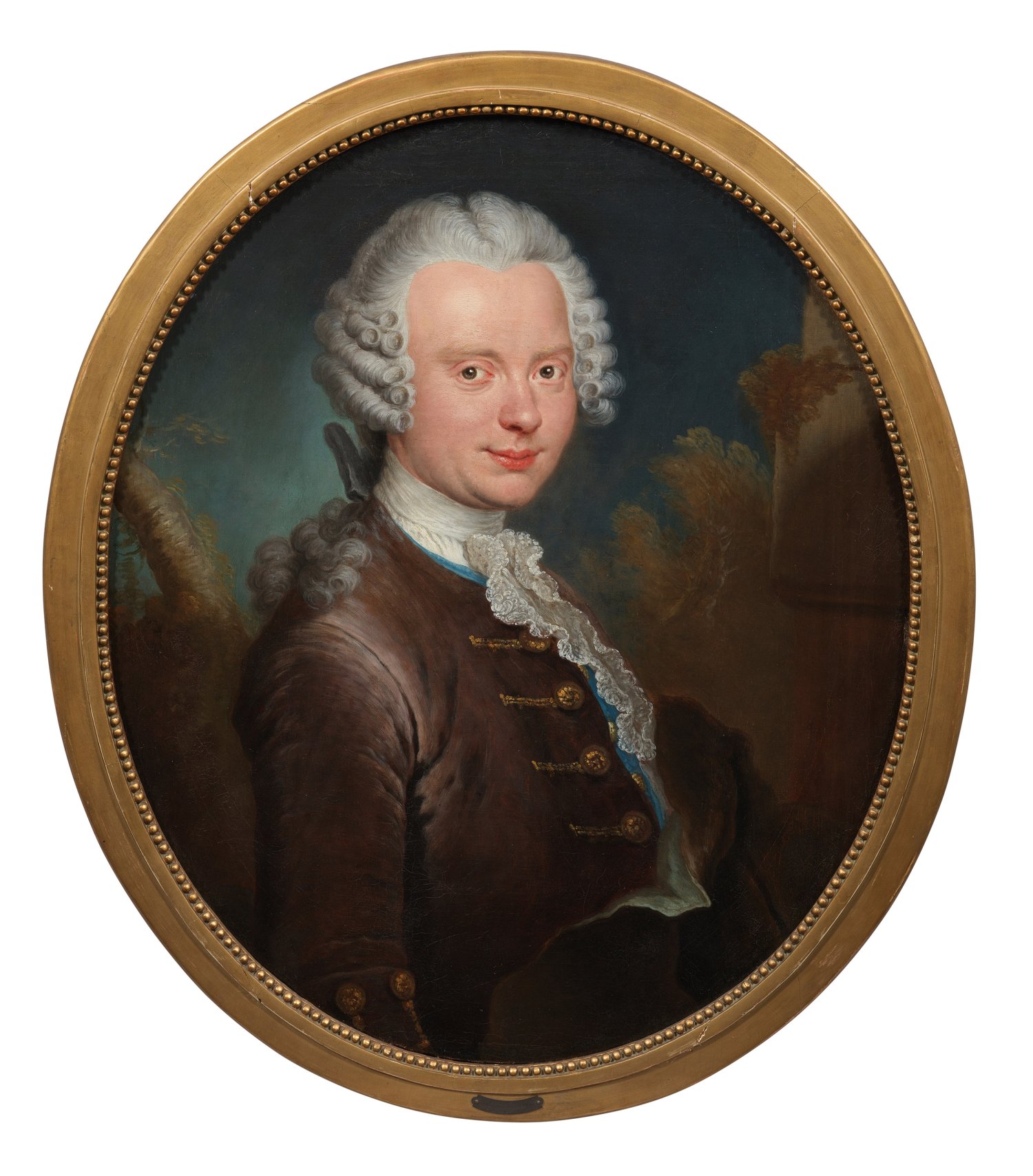 Das repräsentative Bildnis entstand um 1755 und zeigt ihn im Halbprofil in der eleganten Mode der Zeit mit gelockter Perücke, weißer Halsbinde, Spitzenjabot sowie brauner Samtjacke mit goldenen Knöpfen vor Landschaftshintergrund. Der Dargestellte lässt sich durch einen alten Klebezettel auf der Rückseite des originalen Keilrahmens identifizieren: "Jean Platzmann né à (/) Langenberg dans le duché de Berg (/) le 23 aout 1720 mort à Berlin (/) le 22 Janv: 1770 (/) Époux de Marie Magdal: Lautier (/) Père de Henry Charles P:-". In die Irre führt allerdings eine kleine Plakette auf dem Rahmen (wohl aus der Zeit um 1900) mit der gravierten Inschrift "1683 Antoine Pesne 1757 (/) J. Platzmann Lautier (/) Hofjuwelier Friedrichs des Großen". Statt von Antoine Pesne selbst stammt das Porträt nämlich von seinem bedeutendsten, ehemaligen Schüler und Mitarbeiter Joachim Martin Falbe, wofür auch der Stil mit kräftigem, zugleich delikatem, subtil nuanciertem Kolorit spricht. Ekhart Berckenhagen führt in seinem 1989 erschienen Aufsatz "Joachim Martin Falbe" mit einem Werkverzeichnis unter der Nr. 46 ein Bildnis auf, bei dem es sich um das vorliegende Gemälde handelt: "Jean Platzmann (1720-1770, Kaufmann u. Seidenmanufaktur-Inhaber, Hüftbild n. r. vor Landschaft, um 1755, Öl/L oval 77,5 x 65,5, Privatbesitz, Wiesbaden (1953 im Berliner Kunsthandel)". Falbe hatte seit 1733 eine gründliche künstlerische Ausbildung bei Pesne in Berlin absolviert, wurde dessen Meisterschüler und blieb insgesamt 15 Jahre bei ihm. Auf Pesnes Vermittlung erhielt Falbe eine Anstellung am Hof des Fürsten August Ludwig von Anhalt-Köthen, der ihn bei seiner Abreise 1739 zu seinem Hofmaler ernannte. Zurück in Preußen, erhielt er im selben Jahr die Auszeichnung zum königlichen Hofmaler. Pesne und Falbe, der 1756 Ehrenmitglied der Berliner Königlich-Preußischen Akademie der Künste wurde, verband eine gegenseitige, so hohe Wertschätzung, dass ihm Pesne 1757 auf dem Totenbett die Vollendung seiner nicht fertiggestellten Gemälde anvertraute. Öl/Lwd., doubl.; Verso Klebezettel mit Angaben zum Dargestellten. 77,5 cm x 65 cm, im Oval. Rahmen.