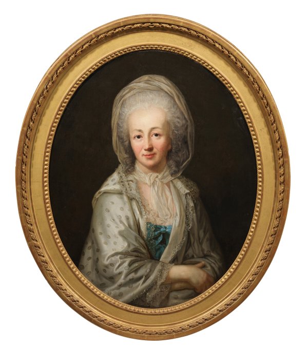 Graff, der als Schöpfer des bürgerlichen Frauen- und Männerporträts in Deutschland gilt, schildert Marie Madeleine Platzmann in einem getupften weiß-rosafarbenen Seidenmantel und mit einem zarten, weißen Chiffontuch, das sie locker am Hals geknotet und über ihr grau gepudertes Haar gelegt hat. Graffs Meisterschaft, dem Wesen einer Person in seinen Porträts künstlerischen Ausdruck zu verleihen, zeigt sich auch in diesem um 1775 entstandenen Bildnis. Er legte es mit weich modellierender Lichtführung vor einem dunklen, neutralen Hintergrund an, höchst subtil nuanciert im Kolorit. Virtuos hat Graff die Stoffe wiedergegeben, doch legt er sein eigentliches Hauptaugenmerk auf den Ausdruck des sanften Gesichts, wie sie uns mit offenem Blick, glänzenden, regen Augen und leicht angedeutetem Lächeln entgegnet, wodurch eine vertraute, dialogartige Beziehung zum Betrachter entsteht. Die Dargestellte war eine Tochter des Berliner Hofjuweliers Pierre Lautier und heiratete 1752 den Berliner Seidenfabrikanten Jean (Johannes) Platzmann (1720 - 1770), nach dessen Tod in zweiter Ehe den preußischen Geheimrat Pierre Vigne. Hierdurch gehörte sie weiterhin zur gehobenen Gesellschaft, daher war kaum ein Anderer und Besserer geeignet, als Graff, um sich porträtieren zu lassen. Der weilte oft in Berlin, um dort Bildnisse auszuführen (und seinen Schwiegervater Johann Georg Sulzer zu besuchen). Das vorliegende Gemälde zeigt sie somit als ungefähr 45-jährige Dame. Bei dem vorliegenden, bisher unpublizierten Gemälde dürfte es sich um eine der drei von Graff eigenhändig für die Kinder Platzmanns angefertigten Versionen handeln. Eine Fassung befindet sich im Herzog-Anton-Ulrich-Museum in Braunschweig (Inv.-Nr. 767), eine zweite Version im Museum in Chemnitz, diese dritte Version befand sich in Winterthurer Privatbesitz. Professor Helmut Börsch-Supan schreibt hierzu: "Wegen seiner herausragenden Qualität halte ich es für eine eigenhändige Arbeit von Graff. In der Leichtigkeit der Handschaft scheint es mir sogar dem Braunschweiger Exemplar überlegen". Die Dargestellte und Anton Graff als Schöpfer des Gemäldes lassen sich überdies durch einen alten Klebezettel in Französisch auf der Rückseite des originalen Keilrahmens identifizieren: "Marie Magdalaine Platzmann (/...) à Berlin le 6 Decem(bre) 1752. morte le 8 Dec:(embre) 1790. (/) La mère de Henry Charles P:(latzmann/) a épousée apres de son (...) second mariage (...) Pierre Vigne peint par Graf la père". 76,5 cm x 63 cm, im Oval. Rahmen.