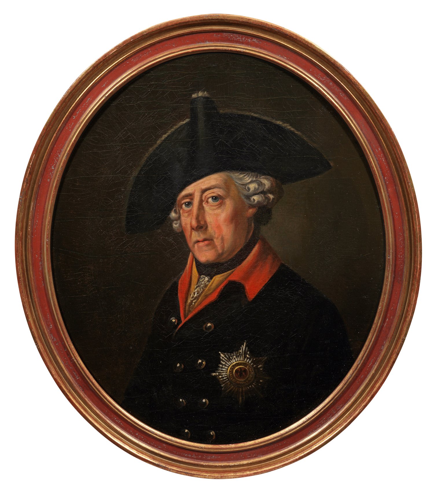 Repräsentatives, ovales Brustbildnis Friedrich II. im Halbprofil in dunkelblauem Uniformrock mit leuchtend rotem Kragen und Bruststern des Schwarzen Adlerordens. Im Unterschied zum berühmten, einflussreichen, 1763/64 im Auftrag des Königs von J. H. C. Franke geschaffenen Gemälde (heute im Besitz der Stiftung Preußische Schlösser und Gärten) zieht er auf diesem jedoch nicht den Dreispitz, sondern behält diesen auf dem Kopf. Das vorliegende Bildnis dürfte kurz nach dem Tod des Königs (1786) entstanden sein, eine Version wurde 1788 als "Bildniß des Hochsel. Königs Friedrich II." auf der Austellung der Berliner Akademie gezeigt, Professor Börsch-Supan schreibt hierzu: "Die Qualität des vorliegenden Gemäldes läßt Eigenhändigkeit vermuten". Die Komposition des Porträts und der Bezug zu Franke ist auch durch einen Kupferstich von Clemens Kohl aus dem Jahr 1791 überliefert, der ausdrücklich auf ein Gemälde Frankes als Vorbild hinweist. Öl/Lwd., doubl.; 75,5 cm x 63 cm. Rahmen. Beigefügt: Gutachten von Professor Dr. Helmut Börsch-Supan, Berlin, 27.11.2022.