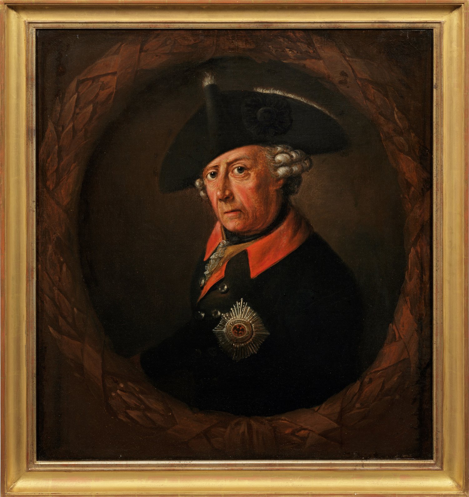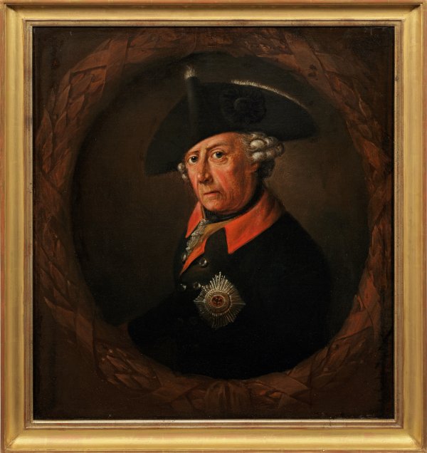 Repräsentatives Brustbildnis Friedrich II. im Halbprofil in dunkelblauem Uniformrock mit leuchtend rotem Kragen und Bruststern des Schwarzen Adlerordens, umrahmt von einem hochovalen Lorbeerkranz. Franke schuf mehrere Typen von Porträts Friedrichs, von denen dasjenige des den Hut ziehenden Monarchen überaus häufig kopiert und in der Kunstgeschichte berühmt wurde. Im Unterschied zu jenem 1763/64 im Auftrag des Königs von J. H. C. Franke geschaffenen Gemälde (heute im Besitz der Stiftung Preußische Schlösser und Gärten) zieht er auf dem vorliegenden jedoch nicht den Dreispitz, sondern behält diesen auf dem Kopf. Das vorliegende Bildnis dürfte um 1764-1780 nach dem Siebenjährigen Krieg gemalt worden sein, als aus dem gealterten König Friedrich II. der "Alte Fritz" und "der Große" wurde. Stark beeinflusst wurde Franke hierbei durch Anna Dorothea Therbusch, die den König in fast identischer Haltung malte. Öl/Lwd., doubl.; 81,5 cm x 70,53 cm. Rahmen.