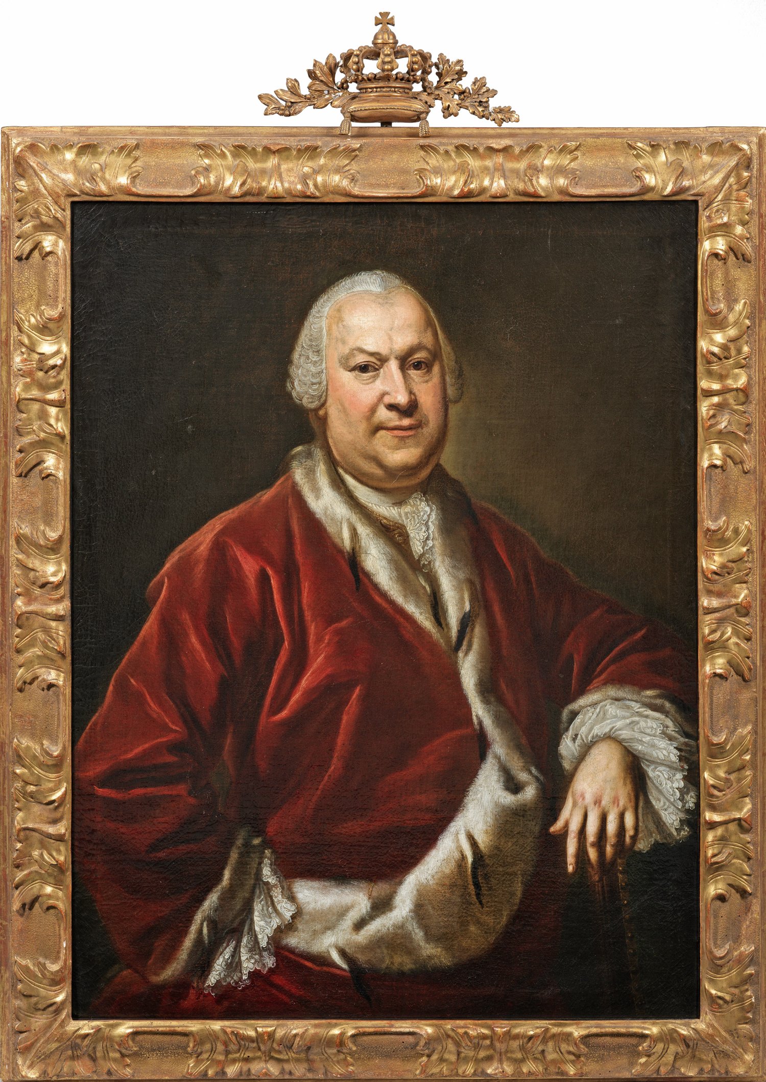 Um 1765 entstandenes, ausdrucksvoll charakterisierendes Hüftporträt des stehenden, älteren, hohen Adeligen in rotem Hermelinmantel, die linke Hand leger auf die Lehne eines Stuhl gelegt, den Kopf mit weiß gepuderter Perücke fast en face mit ruhigem Blick auf den Betrachter gerichtet. Bei dem Dargestellten handelt es sich aufgrund der Porträtähnlichkeit vermutlich um Fürst Ludwig zu Hohenlohe-Langenburg (1696 - 1765), der im Januar 1764 eine Standeserhöhung vom Grafen zum Fürsten erlebte, indem ihn Kaiser Franz I. in den Reichsfürstenstand aufnahm. Wohl aus diesem Anlass gab er ein Bildnis bei einem meisterlichen Porträtisten wie Graff in Auftrag. Graff, den George Desmarées und Antoine Pesne beinflussten, war 1759-1766 in Augsburg tätig, bevor er als Hofmaler nach Dresden berufen wurde. Öl/Lwd.; Verso altes Etikett mit Zuschreibung "Pes(ne)". 95 cm x 73,5 cm. Wohl Original-Rahmen.