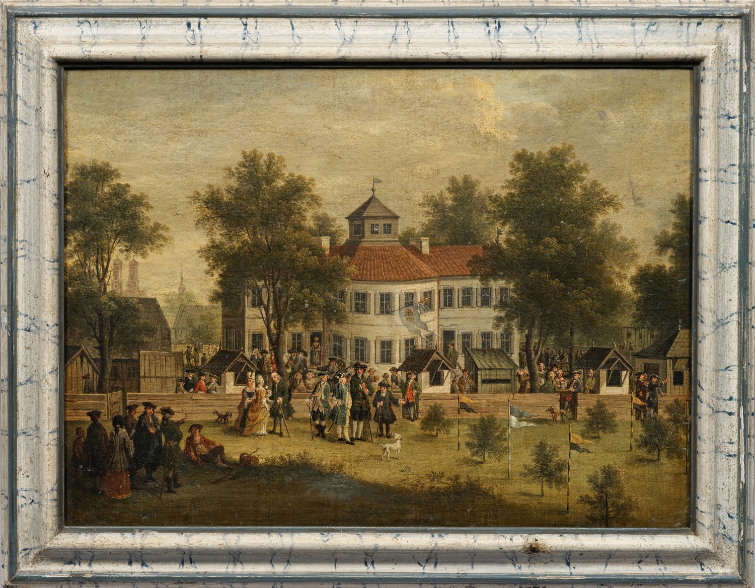 Blick auf das alte Barock-Gebäude der Schützengesellschaft am Karlsplatz bzw. Stachus (auf dem Gelände des heutigen Hauptbahnhofs), in lebendiger Weise belebt durch eine vielfigurige, gemischte Festgesellschaft, die sich sowohl auf dem Platz selbst als auch im Gebäude versammelt hat. Aus einem der höheren Fenster des halbrunden Risalits herausgehängte Fahne mit bayerischem Rautenschild, links im Hintergrund die markanten Türme der Frauenkirche. Öl/Lwd.; 52,5 cm x 71,5 cm. Rahmen.