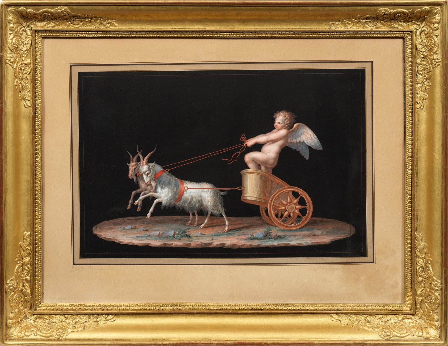 Vor einem schwarzen Grund komponierte Gruppe auf einem Landschaftssockel. Motiv und Stil des klassizistischen Blattes lassen es Maestri zuschreiben, der durch die antiken Fresken in Pompeji und Herculaneum sowie Raffael und Giulio Romano inspiriert wurde. Viele Gouachen Maestris erwarben Adelige während ihrer Grand Tour. Gouache (über Umrissradierung?)/Papier. Unterhalb bez. "Giulio Romano inv. (/) Michelangelo Maestri f.". Blatt ca. 40 cm x 53 cm. Rahmen.