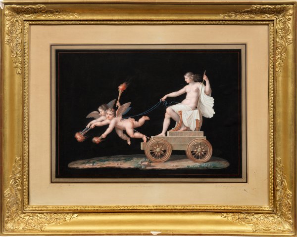 Darstellung vor schwarzem Grund mit einer jungen, weiblichen Figur in einem Triumphwagen, gezogen von zwei schwebenden Amoretten mit brennenden Fackeln. Motiv und Stil des klassizistischen Blattes lassen es Maestri zuschreiben, der durch die antiken Fresken in Pompeji und Herculaneum sowie Raffael und Romano inspiriert wurde. Viele Gouachen Maestris erwarben wohlhabende Reisende und Adelige während ihrer Grand Tour. Das vorliegende Blatt entstand in enger Anlehnung an eine "Venus" betitelte Radierung Tommaso Pirolis in "Peintures de la Villa Lante à Rome" (1. Ausgabe Paris 1803), der hierin wiederum ein um 1520 geschaffenes Fresko von Giulio Romano wiedergibt, das sich einst in der Villa Lante in Rom befand und heute im Palazzo Zuccari zu finden ist. Gouache (über Umrissradierung?)/Papier. Unterhalb bez. "Giulio Romano (/) Michelangelo Maestri". Blatt ca. 40 cm x 53 cm. Rahmen.