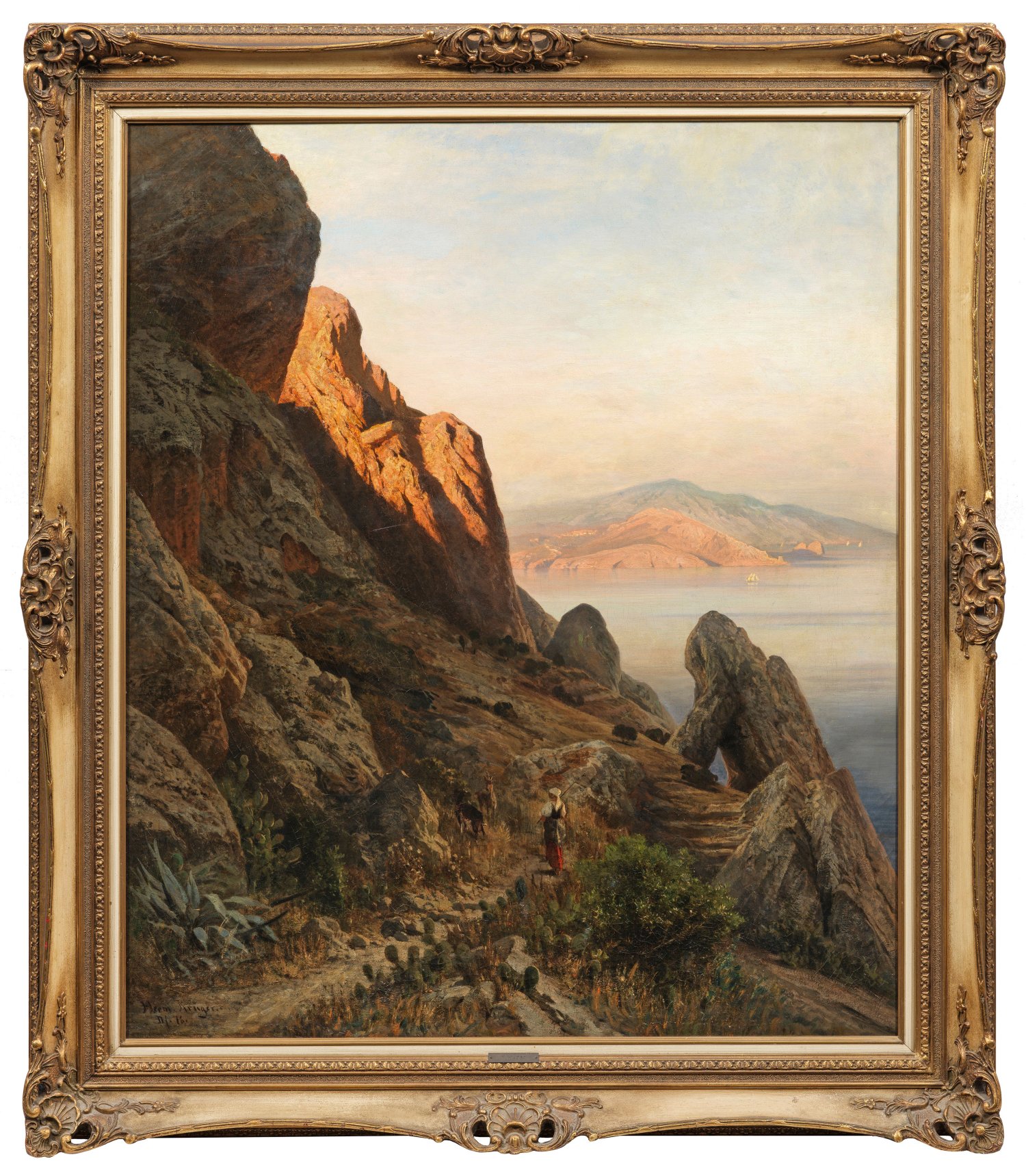 Koloristisch subtil ausgeführte, abendlich gestimmte Landschaft mit effektvollen Licht- und Schattenpartien. Krüger erhielt seine künstlerische Ausbildung als Privatschüler von Adalbert Waagen in München, Max Schmidt in Berlin und seit 1867 bei Albert Flamm in Düsseldorf, wo er sich der dortigen Landschaftsmaler-Schule anschloss. Von dort aus begleitete er sein großes Vorbild, den befreundeten Maler Oswald Achenbach auf seinen Italien-Reisen und erwarb sich neben ihm einen Ruf als Italienmaler. Mit Vorliebe schilderte er Motive aus Süditalien und Sizilien in ihrer Farbenpracht und dem mediterranen Licht. Öl/Lwd.; L. u. sign. u. dat (18)76 mit Ortsangabe Düsseldorf. 110,5 cm x 94,5 cm. Rahmen.
