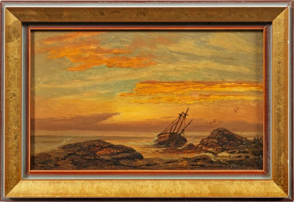Blick auf eine felsige Küstenlandschaft mit dem Wrack eines gestrandeten Segelschiffs im warmen, golden glühendenden Licht der Mitternachtssonne. Douzette, der mit Vorliebe Mondschein- und Abendlandschaften malte, ging 1855 nach Berlin, wo er Schüler des bekannten Marine- und Landschaftsmalers Hermann Eschke wurde. Seit 1860 fuhr er regelmäßig an die Ostseeküste, nach Rügen und auf den Darß, um dort zu zeichnen und zu malen. 1878 reiste Douzette nach Paris, wo er die französische Pleinair-Malerei der Schule von Barbizon kennenlernte. 1895 wurde Douzette wieder ständig in Barth ansässig, 1896 ernannte man ihn zum Professor der Berliner Akademie der Künste. Zugleich war Douzette der nahegelegenen Künstlerkolonie in Ahrenshoop verbunden. Öl/Holztafel. L. u. sign.; Verso zwei alte Etiketten mit Künstler-Bez. u. Betitelung. 17 cm x 26,5 cm. Rahmen.