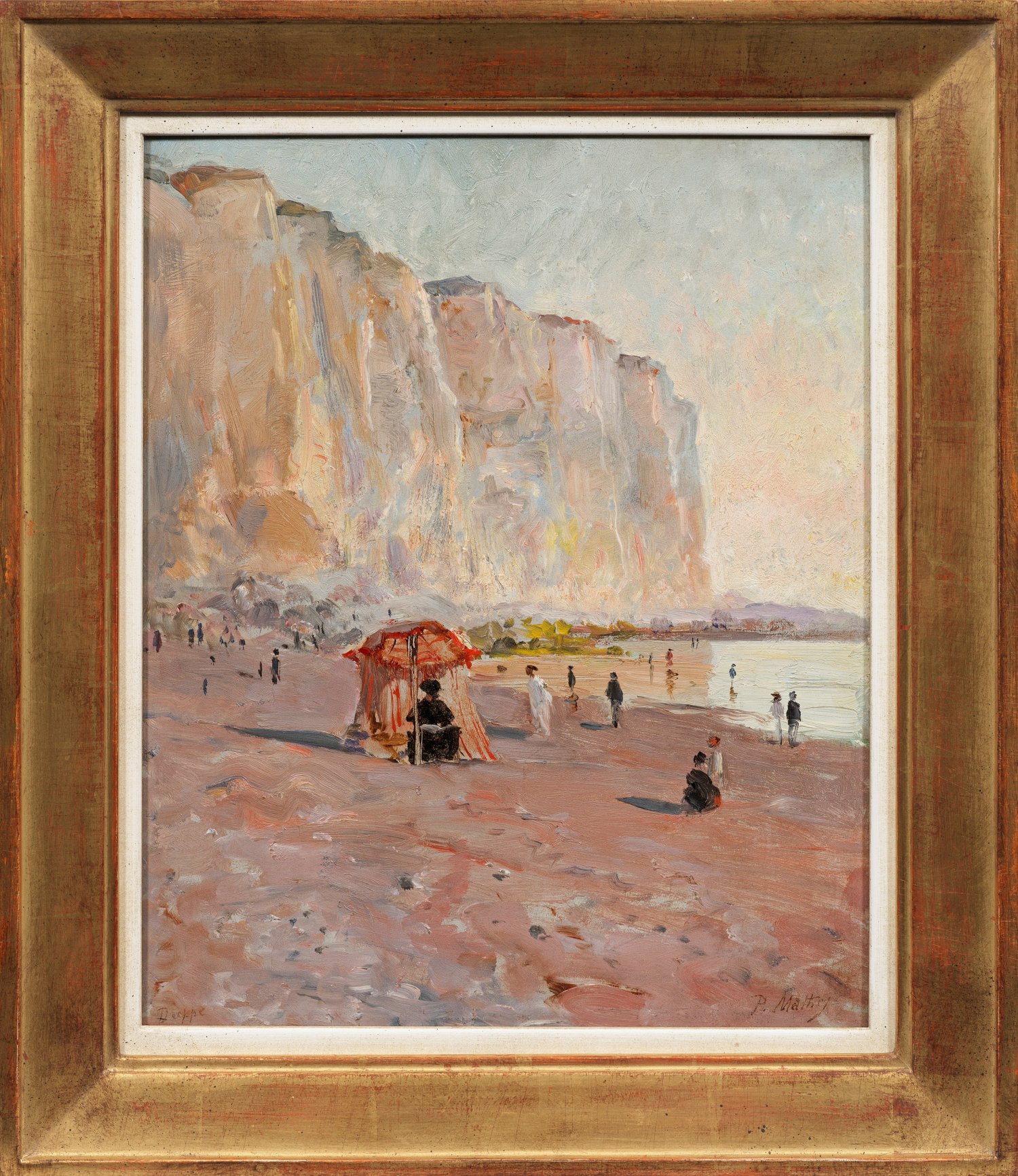 Impressionistische, in hellem, pastelltonigem Kolorit ausgeführte Landschaft aus der Normandie mit Blick auf die imposanten Kreidefelsen. Paul Mathey studierte an der École des beaux-arts in Paris und lernte in den Ateliers von Léon Cogniet, Isidore Pils und Alexis-Joseph Mazerolle. 1868 begann er im Pariser Salon auszustellen. Zwar war Mathey vor allem ein Porträtmaler, schuf jedoch auch Normandie-Landschaften, Marinebilder, Stillleben und Grafiken. Seine Werke wurden mehrfach ausgezeichnet: auf den Salons von 1876 und 1885 sowie mit einer Goldmedaille auf der Weltausstellung von 1889. Überdies ehrte man ihn 1892 mit der Ehrenlegion. Öl/Mahagonitafel. 40,5 cm x 32 cm. Rahmen.