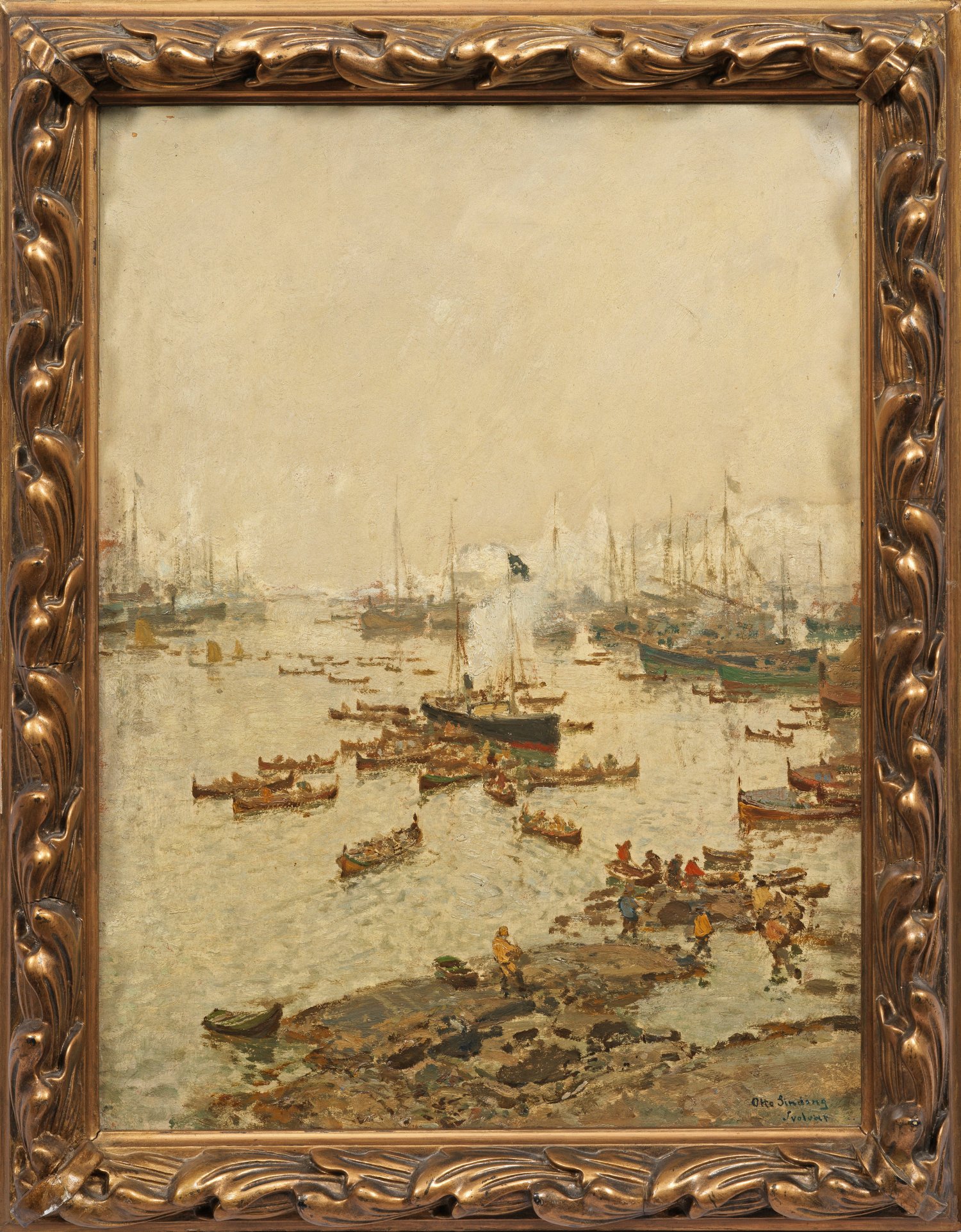 Im stark frequentierten Hafen von Svolvaer in den Lofoten entladen Fischer mit Hilfe von zahlreichen Booten den zurückgekehrten Heringsdampfer. In fein nuanciertem, erdigem Kolorit, impressionistisch durftig um 1886 gemalte Hafenansicht des norwegischen Malers, der seit 1869 vornehmlich in Deutschland ansässig war. Er studierte an der Akademie in Karlsruhe u. a. bei Hans Gude und anschließend bei Carl Theodor von Piloty in München. Öl/Karton. R. u. sign. mit Ortsangabe Svolvaer. Verso betitelt und nochmals sign. oder bez.; Ca. 49 cm x 37 cm. Rahmen.