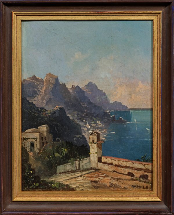 Atmosphärisch gestimmter, koloristisch subtil gemalter Blick über die felsige Küste mit den pittoresken Häusern Amalfis und dem azurblauen Meer. Charakteristische Impression von Reders, der die Motive seiner Landschaftsbilder im Dachauer Moos, aber auch Italien und Spanien fand. Öl/Malpappe. R. u. monogr.; Verso bez. "H. v. Réder (/) amalfi" sowie mit ehemaligem Besitzvermerk. 26 cm x 20,7 cm. Rahmen.