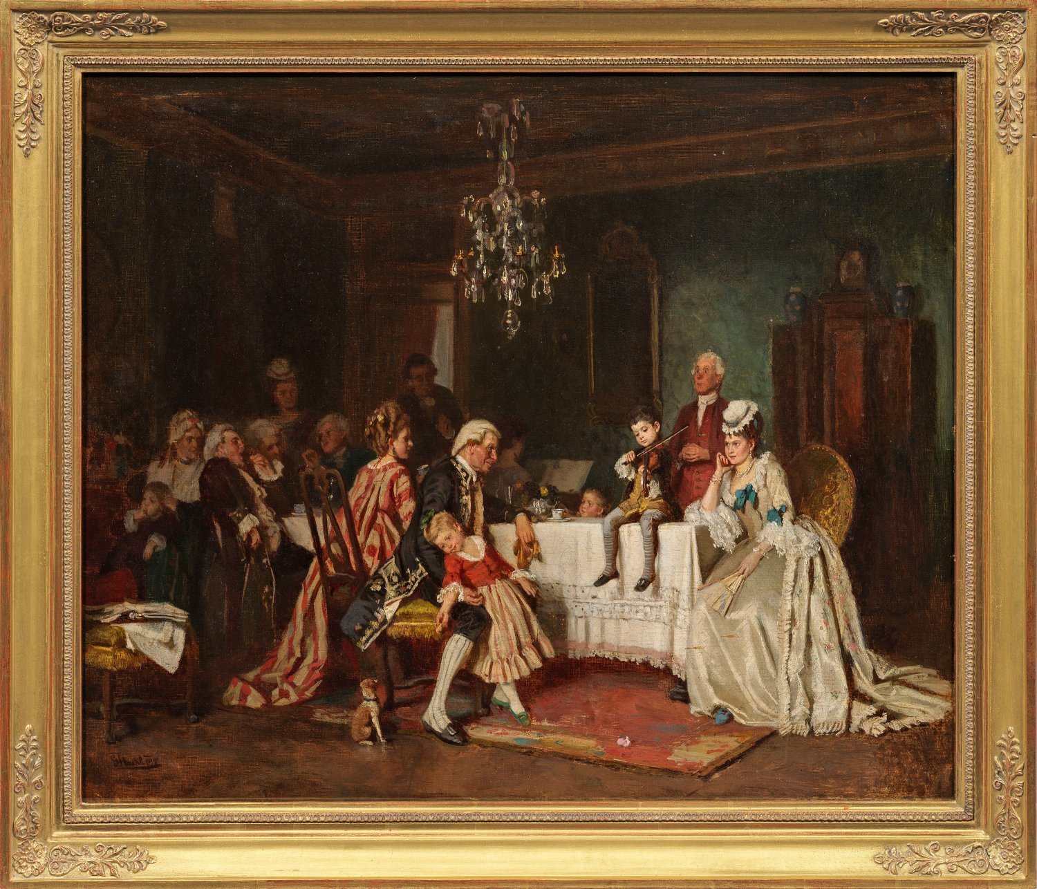 Das vielfigurige, erzählerische Genrebild mit einer Szene aus dem 18. Jh. gehört zu den frühen Hauptwerken des Künstlers. Es wurde im April 1874 zuerst im Münchener Kunstverein mit Erfolg gezeigt und in der Zeitschrift "Kunst-Chronik" ausführlich besprochen: "In zweiter Reihe habe ich 'Das Wunderkind' von (...) Gabr. Hackl, zu nennen. Der Stoff erweist sich als ein brauchbarer: das Wunderkind ist nämlich ein etwa fünfjähriger Virtuos auf der Violine, der in großer Gesellschaft seine Kunst produziert. Die mehr oder minder lebhafte Theilnahme der Anwesenden - die Tafel ward eben aufgehoben und der kleine Künstler sitzt auf derselben, während eine Dame ihn auf dem Clavier begleitet. - ist mit gutem Verständnis zum Ausdruck gebracht und findet ihre äußersten Eckpunkte in einem gähnenden Kavalier am Tische und einem eben in den Saal tretenden, von dem Spiel des Kindes höchlich überraschten Musiker. Die Aufgabe, die sich der Künstler gestellt, war keine leichte und ward trotzdem mit Gewandheit gelöst." Hackl studierte seit 1865 an der Münchener Akademie bei Alexander Wagner und Carl Theodor von Piloty; 1878 wurde er dort selbst Professor, seit 1880 Leiter der Zeichenklasse. Öl/Lwd.; L. u. sign. u. dat. (1)874. Verso auf dem Keilrahmen altes Ausstellungsetikett mit Bez. "Gabr. Hackl (|) Das Wunderkind". 61,5 cm x 74,5 cm. Rahmen.