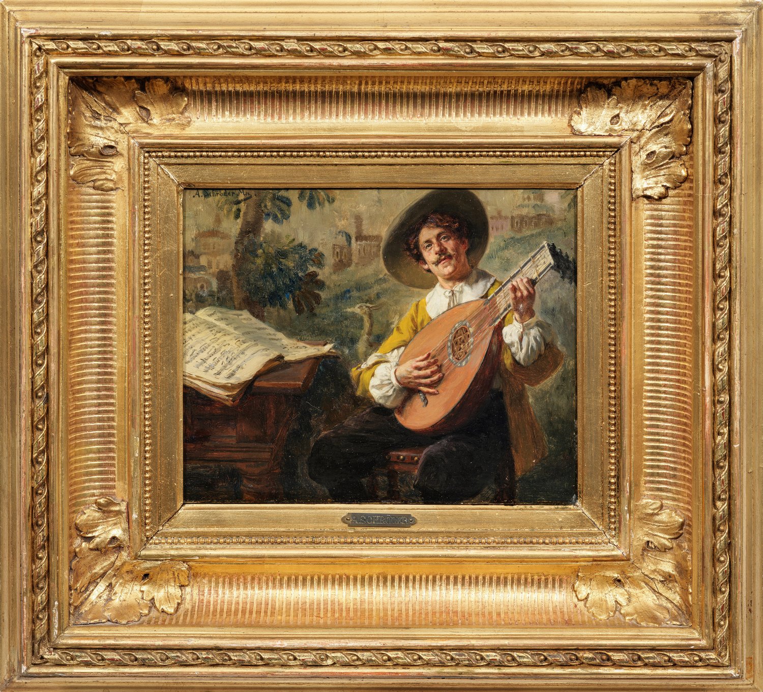 Sensibel charakterisiertes, feinmalerisches Bildnis eines Mandolinenspieler mit aufgeschlagenem Notenbuch, die Landschaft mit Architektur und Vogel im Hintergrund in einer gedämpften Palette und lockerem Duktus ausgeführt. Typisches Genrebild Schröders, das eine besondere stoffliche Präsenz und subtile Lichtführung auszeichnet. Er studierte an der Kunstschule in Weimar bei Charles Verlat und ab 1876 an der Dresdener Akademie bei Ferdinand Pauwels. 1883 ging der Maler nach München, wo er vornehmlich Genreszenen im Stile der niederländischen Meister des 17. und 18. Jhs. schuf. Öl/Holztafel. L. ob. sign. mit Ortsangabe M(ünche)n. 20,1 cm x 25,3 cm. Rahmen.