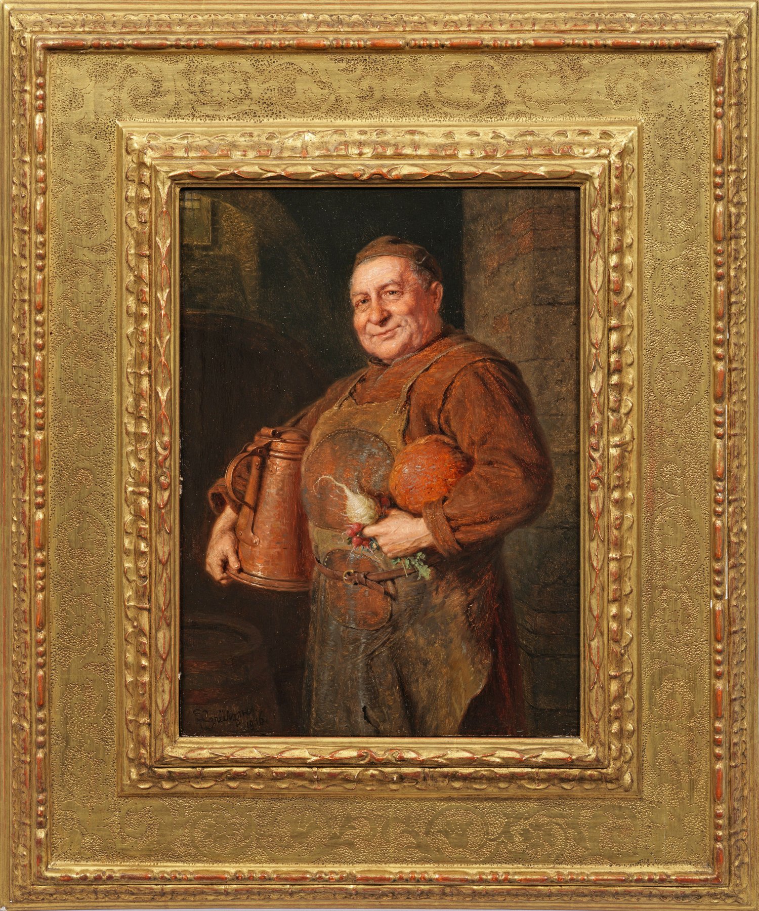 Durch eine effektvolle Lichtführung und ausschnitthafte Komposition vortrefflich inszenierte Darstellung eines Mönches als Kellermeister, verschiedene Rüben und einen große Trinkkanne aus der Vorratskammer tragend. Fein lasierend gemaltes, motiv- und stiltypisches Werk Grützners, in dem seine Meisterschaft in der feinfühligen Charakterisierung seiner Protagonisten und der herausragenden Darstellung von Stofflichkeiten und Lichtverhältnissen deutlich zu Tage tritt. Grützner war Schüler der Münchener Akademie bei Hermann Anschütz und Carl v. Piloty und rasch sehr erfolgreich. Seine Werke, die neben Fallstaff-Darstellungen meist heitere, erzählerische Motive aus dem klösterlichen Leben schildern, erfreuen sich bis heute großer Beliebtheit. Öl/Mahagonitafel. L. u. sign. u. dat. 1916. 31,5 cm x 23 cm. Rahmen.