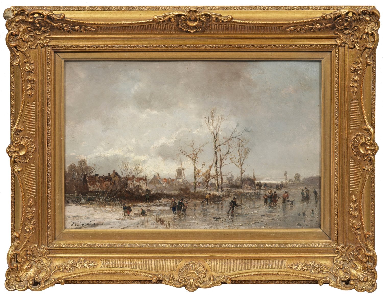 Besonders stimmungsvolles, charakteristisches Werk Stademanns, der bei Carl August Lebschée und Moritz Lotze studierte. Bevorzugt widmete er sich, inspiriert von den niederländischen Meistern des 17. Jhs., der Schilderung von Mondschein- und Winterszenerien, denen er in seinem lockeren Duktus und im Kolorit gekonnt eine stimmungsvolle, impressionistische Note verlieh. Öl/Malkarton. L. u. sign.; 31 cm x 47 cm. Rahmen.