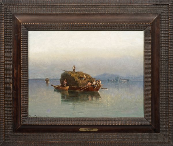 Fein gemaltes, atmosphärisch gestimmtes Chiemgaumotiv mit beladenen Heubooten, Beiboot und Erntehelfern vor alpiner Kulisse und der Silhouette der Fraueninsel. In Sujet und Stil repräsentatives Werk des bedeutenden Vertreters der Münchener Schule, in dem die ruhige abendliche Seestimmung durch eine fein nuancierte, zarte Farbwahl und sensible Lichtbehandlung vortrefflich eingefangen wird. Wopfner studierte 1864-1872 an der Münchener Akademie u.a. bei Carl Theodor von Piloty und freundete sich in dieser Zeit mit Wilhelm Leibl an. 1872 entdeckte er die Landschaft des Chiemgaus mit seiner weitgehend unberührten Natur, den Chiemsee und den dortigen Fischern als fortan wichtigste Motive seines Schaffens. Die Sommermonate verbrachte er seitdem auf der Fraueninsel, um den See in all seinen verschiedenen Stimmungen einzufangen. 1890 wurde Wopfner auf der Ausstellung im Münchener Glaspalast mit einer Goldmedaille ausgezeichnet. Öl/Mahagonitafel. L. u. sign. mit Ortsangabe München u. dat. 1892. Verso Etikett des Malutensilienherstellers Albert Seckstein, München. 40,2 cm x 32 cm. Rahmen.
