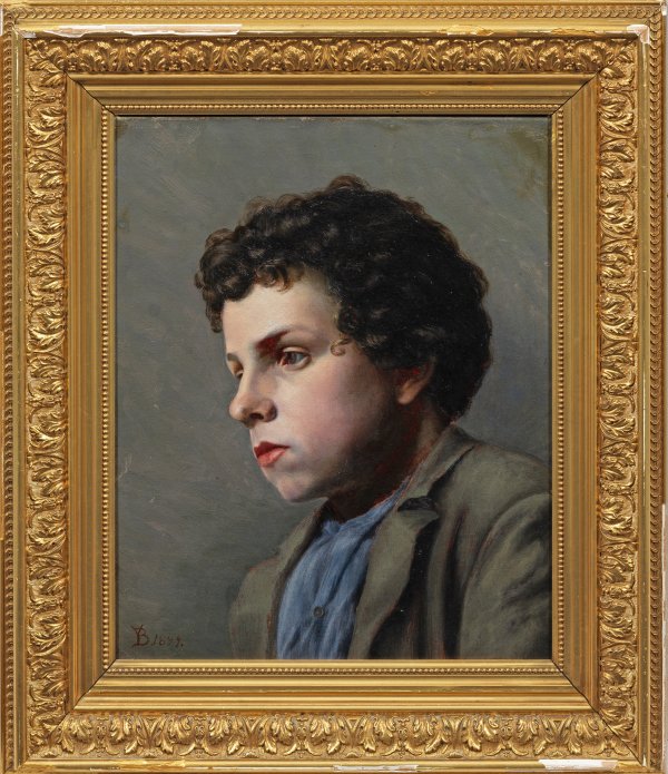 Feinmalerisches, subtil charakterisiertes und in fein nuanciertem, äußerst lebendigem Inkarnatkolorit gemaltes Bildnis eines Knaben mit schwarzem Lockenkopf, dargestellt im Dreiviertelprofil. Öl/Lwd.; L. u. monogr. u. dat. 1893. Verso mit diversen handschriftlichen Bez., Papieretiketten mit Ausstellungsnummer sowie der Kunsthandlung Otto Lemming, Kopenhagen. 40 cm x 33 cm. Rahmen.
