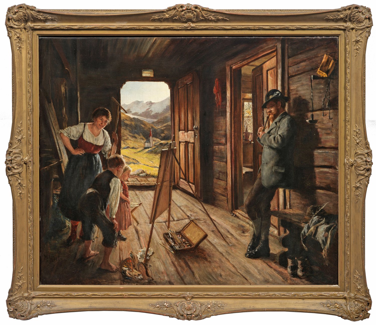 Szenische Darstellung mit staunenden Bauernkindern vor einem Bild auf der Staffelei, rechts der in legerer Pose stehende Maler mit Pfeife, durch die offene Tür Blick auf die kleine Pfarrkirche Obergurgl bei Sölden in Tirol. Stimmungsvolles Hauptwerk Körtes, der 1879-1885 an der Berliner Akademie studierte, danach an der Münchener Akademie. Das vorliegende Gemälde dürfte während seiner Münchener Zeit entstanden sein. Seit 1890 wieder in Berlin ansässig, wurde er zu einem erfolgreichen Porträtisten, beschickte die Akademie-Ausstellungen und Großen Berliner Kunstausstellungen. In den 1890er Jahren wirkte er an der Zeichen- und Malschule des Vereins der Berliner Künstlerinnen, wo er um 1896/97 auch die spätere Paula Modersohn-Becker unterrichtete; 1900-1927 war Körte Lehrer an der renommierten Unterrichtsanstalt des Kunstgewerbemuseums Berlin und an der Akademie der Künste. 1897 ließ er sich ein Sommerhaus in Ahrenshoop errichten, wurde ein Mitglied der dortigen Künstlerkolonie. Öl/Lwd., doubl.; L. u. sign.; Verso alter Klebezettel mit Ortsangabe Obergurgl im Ötztal. 70 cm x 85 cm. Rahmen.