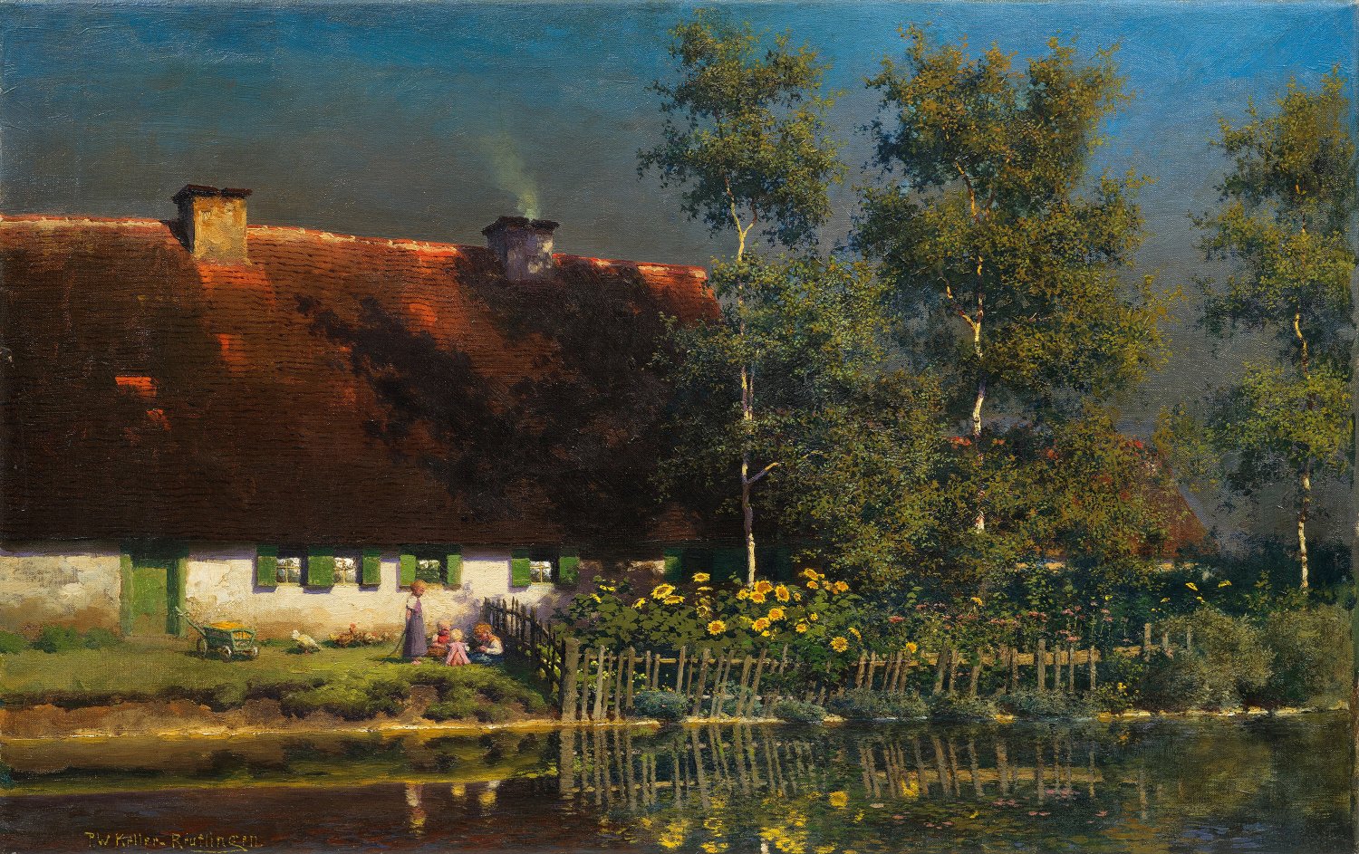 Stil- und motivtypisches Gemälde des Künstlers, dessen Darstellung durch intensive, frisch leuchtende Farbakzente und starke, effektvolle Lichtkontraste gekennzeichnet ist. Hierbei arbeitet Keller-Reutlingen auch geschickt mit Spiegelungen im Wasser, insbesondere des eingezäunten Bauerngartens mit seinen leuchtend gelben, blühenden Sonnenblumen. Keller-Reutlingen, der in Stuttgart und München studierte, faszinierten besonders Motive wie Bauernhöfe und Bauernmädchen als Enten- oder Gänsehirtinnen mit tiefem Stimmungsgehalt, wodurch für ihn die Möglichkeit entstand, Atmosphäre, Licht und Farbe in einem einzigen Bild zu schildern. Außer im Münchener Glaspalast zeigte er seine Bilder auch in der Münchener Secession, deren Gründungsmitglied er 1893 war. Öl/Lwd.; L. u. sign.; 37,5 cm x 58,5 cm.