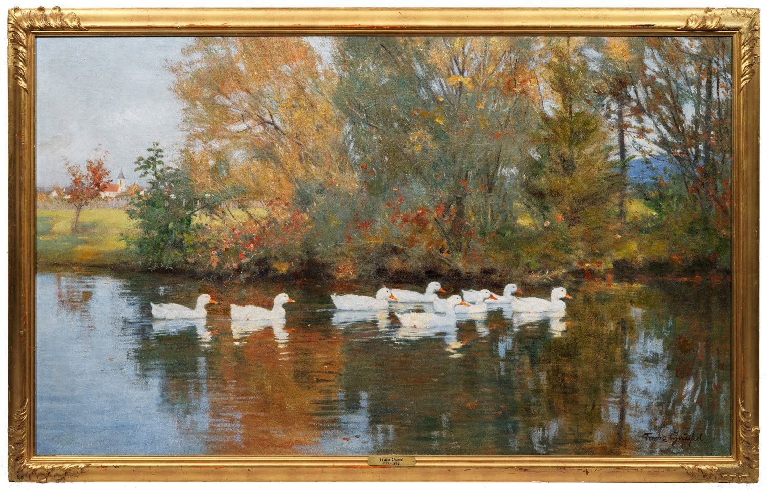 Impressionistische, in hellem, pastelltonigem Kolorit gemalte, spätsommerlich gestimmte, idyllische Darstellung. Im Vordergrund die Enten auf einem Weiher oder ruhigem Flusslauf mit baumbestandenem Ufer, im Hintergrund ein Kirchdorf. Gräßel studierte 1878-1890 an der Karlsruher und Münchener Kunstakademie, 1891-1893 kehrte er zu Studien nach Obersasbach zurück. In den 1890er Jahren wandte sich Gräßel Tiermotiven, besonders Enten zu, die zu seinen Hauptmotiven wurden, annähernd zeitgleich mit Alexander Koester. 1900 wurde Gräßel in Emmering bei Fürstenfeldbruck ansässig, wo sich eine Künstlerkolonie gebildet hatte, die als "Brucker Maler" bekannt wurde. Seit 1888 erhielt Gräßel mehrere Auszeichnungen für seine Werke, darunter 1897, 1909 und 1910 Goldmedaillen in München und Buenos Aires. Öl/Lwd.; R. u. sign.; 70 cm x 117 cm. Rahmen.