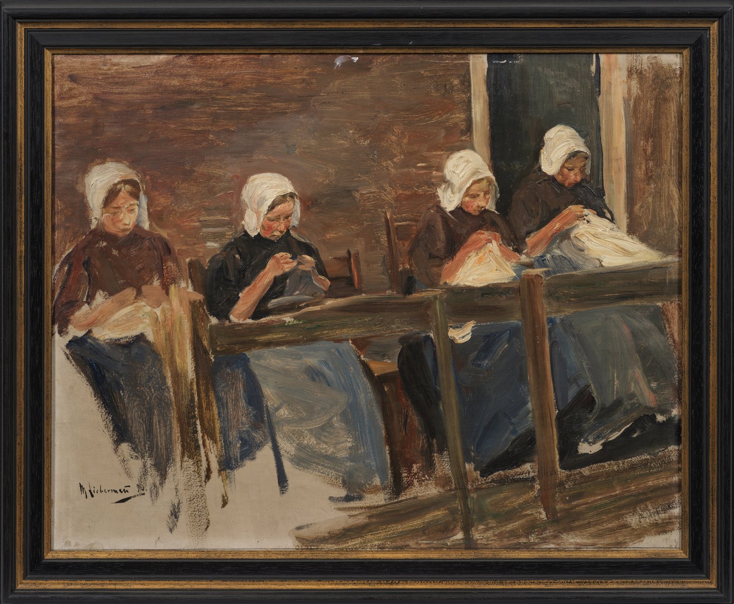 Eines der frühen Hauptthemen Liebermanns in den 1880er Jahren bis um 1890 waren Menschen bei ihren alltäglichen Tätigkeiten. Hierbei befasste er sich während seiner regelmäßigen, mehrwöchigen Malaufenthalte in den Niederlanden auch intensiv mit der Beobachtung von ländlichen Arbeits- und Produktionsabläufen, die ihn faszinierten, wie bei seiner berühmten "Rasenbleiche". Einige Studien zu "Nähenden" entstanden schon in Brabant zu Beginn der 1880er Jahre, in Amsterdamer Waisenhäusern und Stiften sowie südöstlich hiervon in Huyzen bei Laren. Die hier vorliegende Studie zeigt vier aufgereiht nebeneinander sitzende, junge Frauen, die in stillem Ernst ganz vertieft in ihre Näh- und Stickarbeit sind und denen Liebermann mit seiner Darstellung ihrer "niederen Arbeit" hier Würde und Respekt verleiht. Sie steht vermutlich am Beginn einer kleineren Werkreihe von Näherinnen-Darstellungen aus Huyzen, die nicht in größere Kompositionen umgesetzt wurden. Liebermann hat das Motiv mit virtuos zügigem, breitem Duktus und weich-pastosem Farbauftrag ausgeführt und hierbei bewusst einen Teil des Malgrundes stehen gelassen. Dieses "non finito“ korrespondiert mit dem unmittelbaren, impressionistischen Erfassen des flüchtigen Augenblicks und Eindrucks. Öl/Karton, alt auf Leinwand kaschiert. L. u. sign. u. dat. (18)90. 46,7 cm x 61 cm. Rahmen.