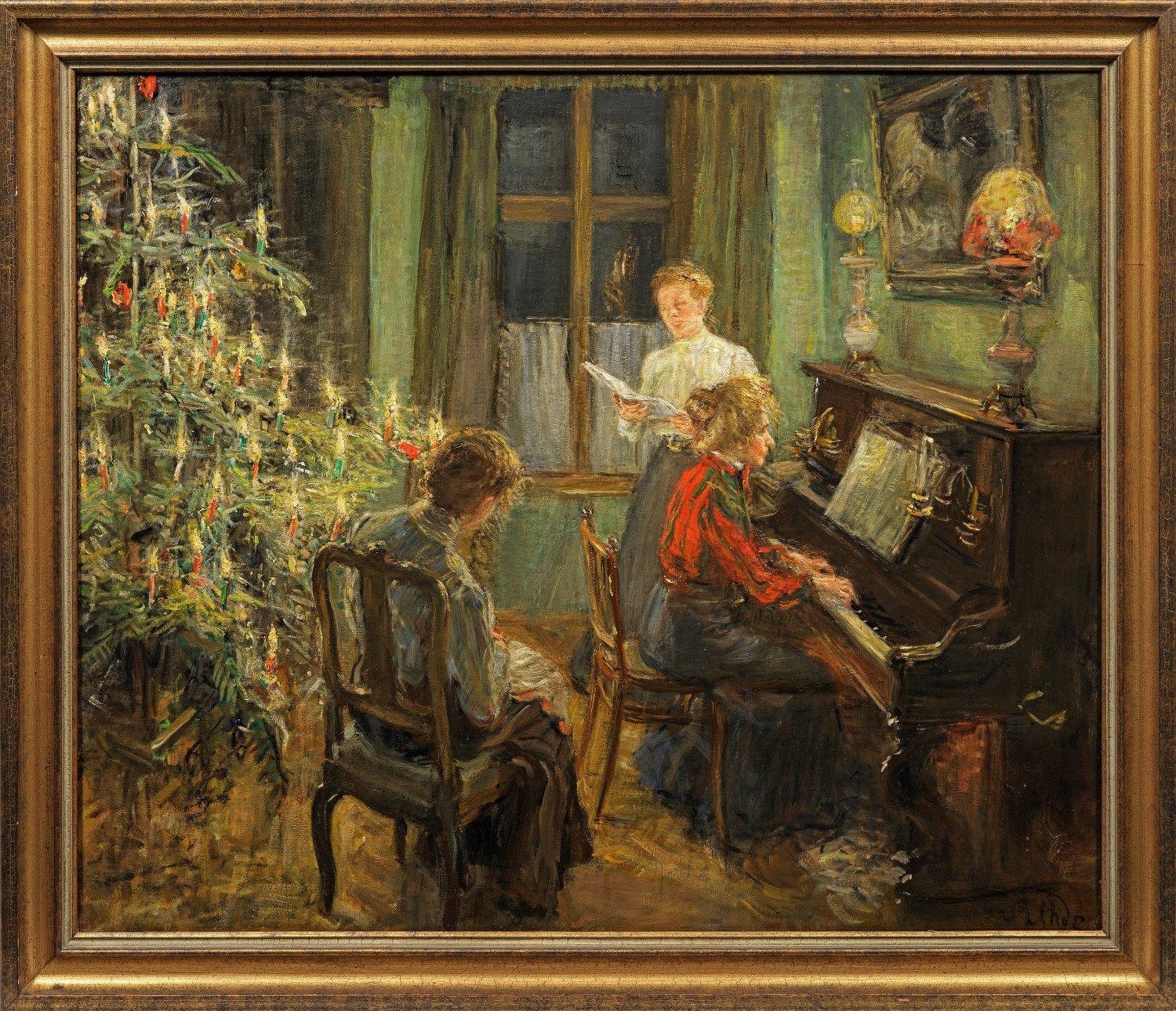 Großformatiges Hauptwerk des Malers von 1902/03, das er gleich nach der Vollendung 1903 in der Ausstellung der Münchener Secession zeigte, wo es noch während der Ausstellung verkauft wurde, wahrscheinlich an den Koblenzer Industriellen Carl Spaeter. Schon vorher hatte Uhde seine drei Töchter als Lieblingsmodelle in mehreren Gruppenbildnissen gemalt. 1902/03 dienen sie ihm nun geschickt als Staffage, als Licht- und Farbenträger für impressionistisch gemalte Interieurbilder. Eines der schönsten und vorzüglichsten davon ist zweifelllos dieses in seiner Lichtwirkung ganz besonders gelungene Gemälde, in dem der Reiz des künstlichen Lichts dargestellt wird. 1908 hat es sein Biograph Hans Rosenhagen treffend beschrieben: "Wie es von den Kerzen des Weihnachtsbaums durch des Künstlers Wohnzimmer strahlt, wo die Töchter am Klavier, das die eine spielt, dem Vater 'Stille Nacht, heilige Nacht' vorsingen (S. 244 u. 245). Und der Künstler lässt, um die Sache luminaristisch recht interessant zu machen, dieses Kerzenlicht mit dem Lichte zweier großer Lampen sich streiten.". Neben dem befreundeten Max Liebermann, Max Slevogt und Lovis Corinth gehört Uhde um 1900 auf dem Höhepunkt seiner Kunst zu den bedeutendsten Meistern des deutschen Impressionismus. Nach Anfängen im Realismus fand Uhde in den 1880er Jahren zur Pleinair-Malerei, wurde zu einem der wichtigsten Wegbereiter des Impressionismus. Hierbei befasst er sich intensiv mit stimmungsgebenden Licht- und Farbwirkungen bei gelockerter Pinselführung und aufgehellter Farbpalette, wandte die impressionistischen Stilmittel geschickt auch bei seinen Gartenbildern und Interieurs an. 1892 wurde Uhde Mitbegründer der "Münchener Secession" (später im Vorstand), im selben Jahr Gründungsmitglied und Vorsitzender der Künstlergruppe "Vereinigung der XXIV". Öl/Lwd.; R. u. sign.; 100 cm x 120 cm.