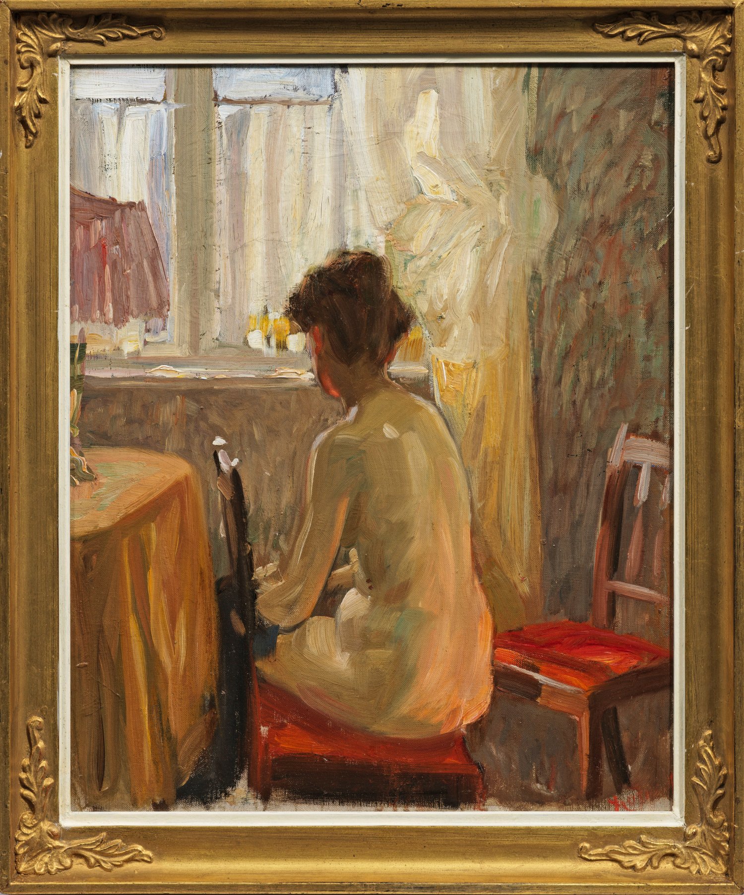 In breiten, lockeren, teils pastosen Pinselstrichen in leuchtendem, fein nuanciertem Kolorit gemalte, ausschnitthaft angelegte Darstellung eines sonnendurchfluteten Zimmers, in dem eine junge Frau auf einem Stuhl sitzt, den Blick gen Fenster richtet und somit dem Betrachter den Rücken zuwendet. Sensibel geschilderte, intime Szene, die die Licht- und Farbstimmungen künstlerisch herausragend einfängt. Kuehl studierte an der Dresdener und Münchener Akademie. Nach seiner ersten Begegnung mit dem französischen Impressionismus 1873 auf der Wiener Weltausstellung, wurde er 1878-1889 in Paris ansässig. Sein Oeuvre umfasst außer stillen Interieurs, Genreszenen und Stadtansichten auch eine Reihe von Kircheninterieurs. Kuehl gilt als bedeutender Vertreter des frühen deutschen Impressionismus und beeinflusste als einflussreicher und erfolgreicher Lehrer zahlreiche bedeutende Maler wie u. a. Otto Pippel. Öl/Lwd.; R. u. undeutl. sign.; 47,3 cm x 39,3 cm. Rahmen.