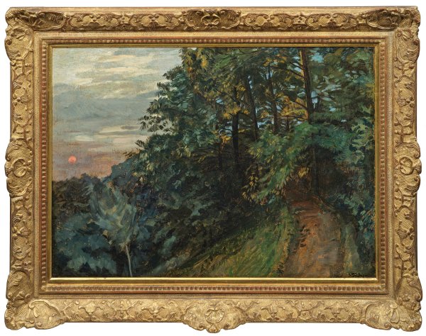 Impressionistische, mit virtuos lockerem, breitem Duktus gemalte Landschaft, der Blick auf einen Weg zum Kastanienwald, der Abendhimmel in der oberen linken Ecke mit untergehender Sonne. 1889 entstandenes, mehrfach publiziertes Werk Trübners, der mit Lovis Corinth, Max Liebermann, Carl Schuch und Max Slevogt zu den bedeutendsten Wegbereitern des Impressionismus in Deutschland zählt. Ausgebildet an der Karlsruher Kunstschule, an der Münchener Akademie und in Stuttgart, war sein Stil zunächst vom Realismus, Gustave Coubet und Wilhelm Leibl beeinflusst, bevor er zum Impressionismus fand. Seit 1889 widmete er sich verstärkt der Landschaftsmalerei. 1894 wurde Trübner Mitglied der "Münchener Secession", 1901 der "Berliner Secession". 1896 berief man ihn ans Städelsche Kunstinstitut in Frankfurt/M., 1903-1917 war er Professor an der Karlsruher Akademie. Öl/Eichenholztafel. R. u. sign.; 57 cm x 76,5 cm. Rahmen.