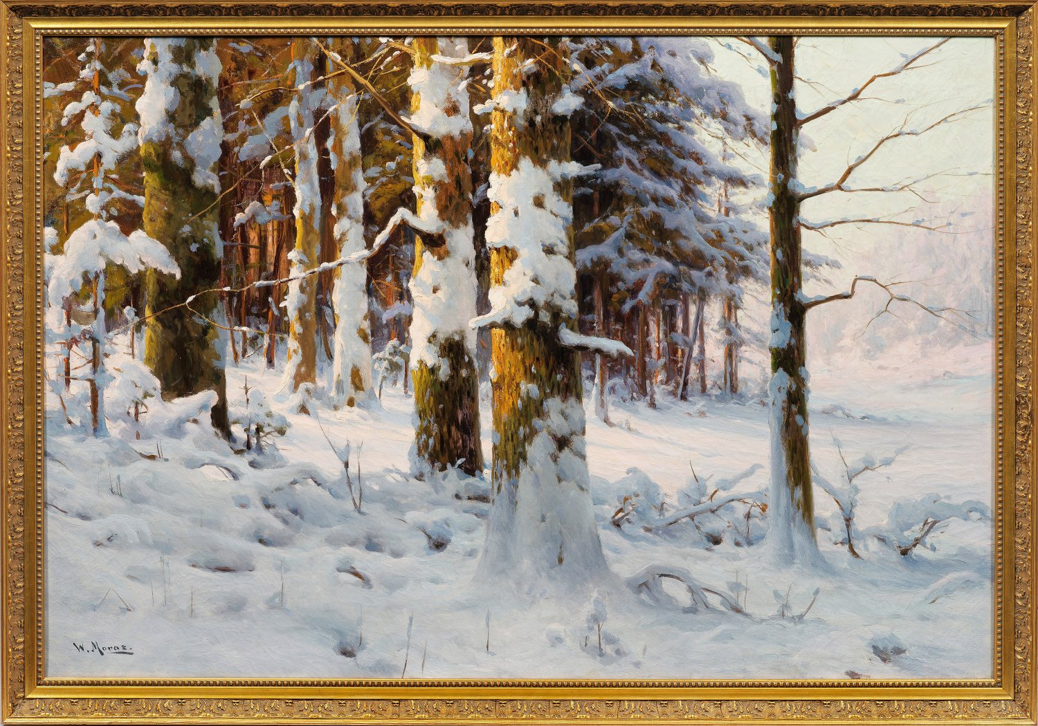 Äußerst stimmungsvolle, großformatige Waldimpression, die die morgendliche, zartrosa gefärbte Lichtstimmung in einem tief verschneiten Waldstück meisterlich einfängt. Feinmalerisches, in virtuos nuancierter Licht- und Farbbehandlung ausgeführtes, charakteristisches Werk des Berliner Künstlers, der vornehmlich Motive aus dem Spreewald zu unterschiedlichen Tages- und Jahreszeiten in warmtoniger Freilichtmalerei umsetzte. Ausgebildet im Atelier des Marine- und Landschaftsmalers Hermann Eschke, beteiligte sich Moras rege an den Berliner Akademieausstellungen, den Großen Berliner Kunstausstellungen sowie den Schauen des Bremer und Oldenburger Kunstvereins und den Münchener Jahresausstellungen. Öl/Lwd.; L. u. sign.; 80,5 cm x 120 cm. Rahmen.