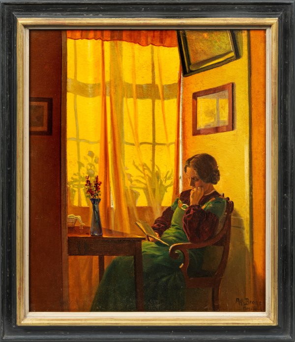 Lyrisches Werk des 1889-1891 an der Akademie von Rudolf Bissen ausgebildeten Malers, das durch die subtile Licht- und Farbstimmung herausragt. Broge stellte mit Vorliebe Mädchen und junge Damen in teilw. biedermeierlichen Interieurs dar, wodurch er in der Tradition von Peter Ilsted und Vilhelm Hammershøi stand. Broge studierte 1889-1891 an der Kopenhagener Kunstakademie und beteiligte sich seit 1891 an vielen Kunstausstellungen, 1894-1917 regelmäßig an den Frühjahrsausstellungen in Charlottenborg. Öl/Lwd.; R. u. sign. u. dat. 1909-10. 58 cm x 50 cm. Rahmen.