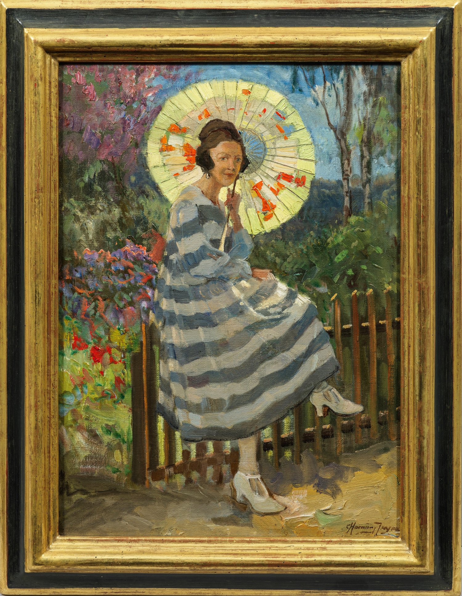 Impressionistisch angelegte, farbenfrohe Darstellung einer jungen Frau mit japanischem Papierschirm, die auf dem Zaun eines sommerlich blühenden Gartens sitzt. In Stil und Motiv charakteristisches, frühes Werk Hornung-Jensens, der 1904 -1906 an der Akademie in Kopenhagen studierte und anschließend seine Studien in Paris fortsetzte, zunächst bei Christian Krohg und Frits Thaulow an der Akademie Colarossi und dann an der École Nationale des Beaux-Arts bei Gabriel Ferrier und Léon Bonnat. Während seiner Pariser Zeit machte sich Hornung-Jensen mit der impressionistischen Freilichtmalerei und der naturalistischen Arbeitsweise betraut. Sein Oeuvre umfasst neben Porträts, Genremotive und Interieurs mit Figuren auch Landschaften. Hierbei malte er lichterfüllte Küsten in der Tradition der Skagen-Maler, aber auch dörfliche Motive und die vielfältigen dänischen Landschaften, wobei er sich der Künstlergruppe der "Dyrhavemaler" anschloss, die in Dyrhaven bei Kopenhagen malten. Seit 1909 war Hornung-Jensen regelmäßig auf den Charlottenborg-Ausstellungen vertreten. Öl/Lwd.; R. u. sign.; 43 cm x 32 cm. Rahmen.