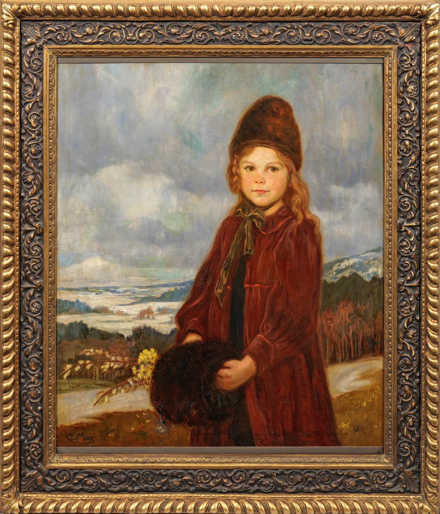 Reizvolles, mit weichem Schmelz gemaltes, einfühlsames Dreiviertelporträt eines blonden Mädchens in einem warmen Mantel mit Pelzmütze und Muff, dem Betrachter mit offenem Ausdruck und leuchtenden Augen freundlich entgegenblickend. Die weite Landschaft im Hintergrund mit bereits eingesetzter Schneeschmelze sind zusammen mit den Weidenkätzchen und gelben Primeln in ihrer Hand erste Frühlingsvorboten. 1910 entstandenes, in Motiv und Stil charakteristisches Werk des Künstlers im Stil der "Jugend". Corneille Max erhielt seine erste künstlerische Ausbildung bei seinem berühmten Vater, dem "Malerfürsten" Gabriel von Max und vollendete sie an der Münchener Kunstakademie bei Gabriel von Hackl und der privaten, modernen Kunstschule von Anton Azbé in München. Ab 1907 stellte er regelmäßig mit Erfolg im Münchener Glaspalast und in der Münchener Künstlergenossenschaft aus. Besonders mit seinen Kinderbildern hatte er großen Erfolg. Ö/Lwd.; L. u. sign. u. dat. (19)10. 93 cm x 81 cm. Dekorativer Prunkrahmen.