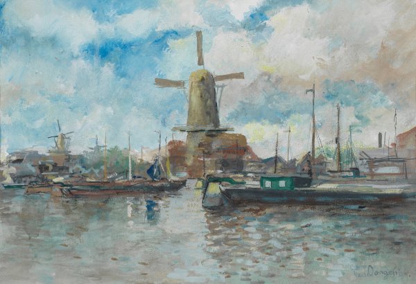 Durch atmosphärische Wasserspiegelungen effektvoll inszenierte Ansicht des historischen Hafens von Rotterdam unter duftig bewölktem Sommerhimmel. In Stil und Motiv charakteristisches Blatt für das frühe Oeuvre van Dongens, der 1892-1894 an der Akademie in Rotterdam studierte. 1897 hielt sich van Dongen für einige Monate in Paris auf und ließ sich schließlich 1899 dauerhaft in der französischen Kunstmetropole nieder. Aquarell/Bütten. R. u. bez. "van Dongen" und dat. (18)96. 38,2 cm x 56,6 cm. Rahmen.