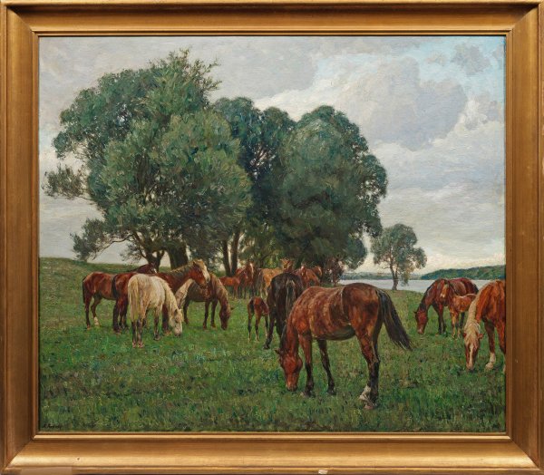 Auf einer tiefgrünen Wiese mit Laubbäumen mit sanft dahin fließendem Flusslauf, unter locker bewölktem Himmel eine in friedlicher Atmosphäre weidende große Pferdeherde. Höchst lebendige, naturalistische Tierschilderung Roloffs, der sich durch ausführliche Naturstudien eine herausragende plastisch-realistische Technik erwarb. Besondere Meisterschaft entwickelte, der auch als "Pferde-Roloff" bekannte Künstler, in der eindringlichen Darstellung von Pferden in Bewegung. Hierbei stellt die Flucht vor Brand und kraftvollen Naturgewalten wie Gewitter und Sturm ein oftmals wiederkehrendes Motiv in seinen Werken dar. Nach seinem Studium an der Berliner Kunstakademie 1896-1901 beteiligte sich Roloff rege an den Großen Berliner Kunstausstellungen und zeigte seine Werke, zu denen auch eine Reihe von Schlachten- und Kriegsdarstellungen zählten, regelmäßig auf der Großen Deutschen Kunstausstellung im Haus der Kunst in München. Schon früh war er als Illustrator für das Verlagshaus für Volksliteratur und Kunst in Berlin-Kreuzberg tätig und machte bald auch weitere, renommierte Verlagshäuser auf sich aufmerksam. Als gefragter und erfolgreicher Illustrator schuf er eine Vielzahl an Titelblättern für die damals äußerst populären, sog. Groschenhefte. Nach dem Zweiten Weltkrieg lebte Roloff zurückgezogen in Rade bei Rendsburg. Öl/Lwd.; L. u. sign.; Verso Etiketten mit Ausstellungsnummern der (Großen) Berliner Kunstausstellung 1910 und 1920. 100 cm x 120 cm. Rahmen.
