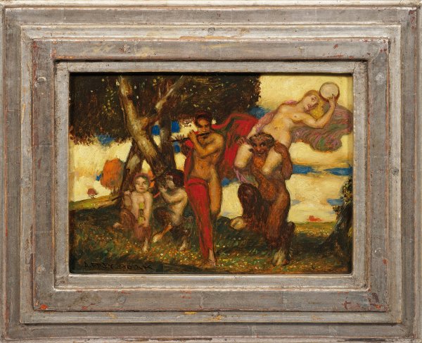 Beschwingt heitere, gekonnte Komposition mit ausgelassener Szene in arkadischer, abendlicher Landschaft. Im Vordergrund eine Querflöte spielende Bacchantin, flankiert von zwei sitzenden, jungen Faunen und einem älteren Faun, der eine Bacchantin mit Tamburin auf dem Rücken davonträgt. Motiv- und stiltypisches, symbolistisches Jugendstil-Bild des Schweizer Malers, der 1902 nach München ging, wo er seit 1904 an der Akademie bei Karl Raupp und Wilhelm von Diez studierte und 1904 Assistent von Franz von Stuck wurde. In seinen Werken wurde er intensiv sowohl durch Stuck als auch von Böcklin beeinflusst. Öl/Holztafel. L. u. sign.; 24 cm x 31,5 cm. Rahmen.