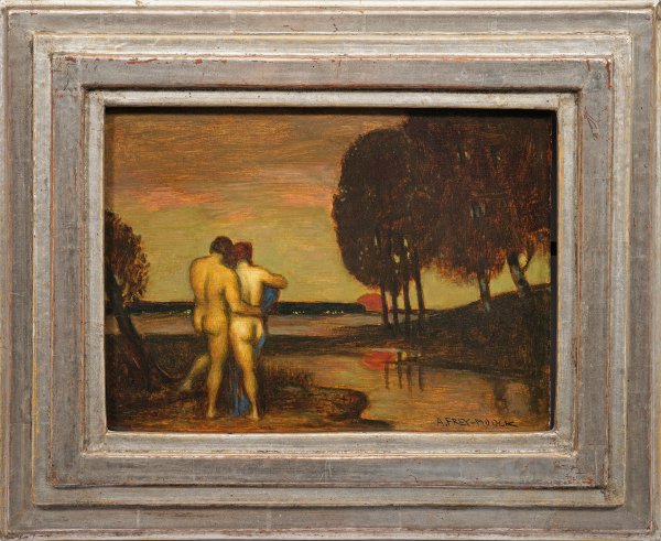 Aktdarstellung in Rückenansicht. Motiv- und stiltypisches, symbolistisches Jugendstil-Bild des Schweizer Malers, der 1902 nach München ging, wo er seit 1904 an der Akademie bei Karl Raupp und Wilhelm von Diez studierte und 1904 Assistent von Franz von Stuck wurde. In seinen Werken wurde er intensiv sowohl durch Stuck als auch von Böcklin beeinflusst. Öl/Holztafel. R. u. sign.; 23,5 cm x 32 cm. Rahmen.