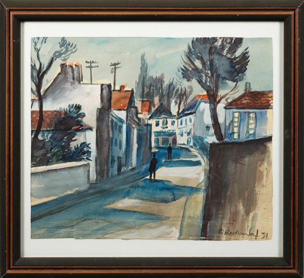 Expressionistische, locker angelegte Straßenansicht in ruhiger Atmosphäre und reizvoller Lichtführung mit langen, dunklen Schatten. Heckendorf, der an der Berliner Kunstgewerbeschule und der dortigen Akademie ausgebildet wurde, stellte ab 1909 regelmäßig in der Berliner Secession aus und zählt neben den "Brücke"-Künstlern zu den überzeugendsten und prominentesten Expressionisten in der Weimarer Republik; Unter dem NS-Regime wurden seine Werke als entartet verfemt. Aquarell/chamoisfarbenes Papier. R. u. sign. und dat. (19)51. Ca. 37,2 cm x 44,6 cm. Rahmen.