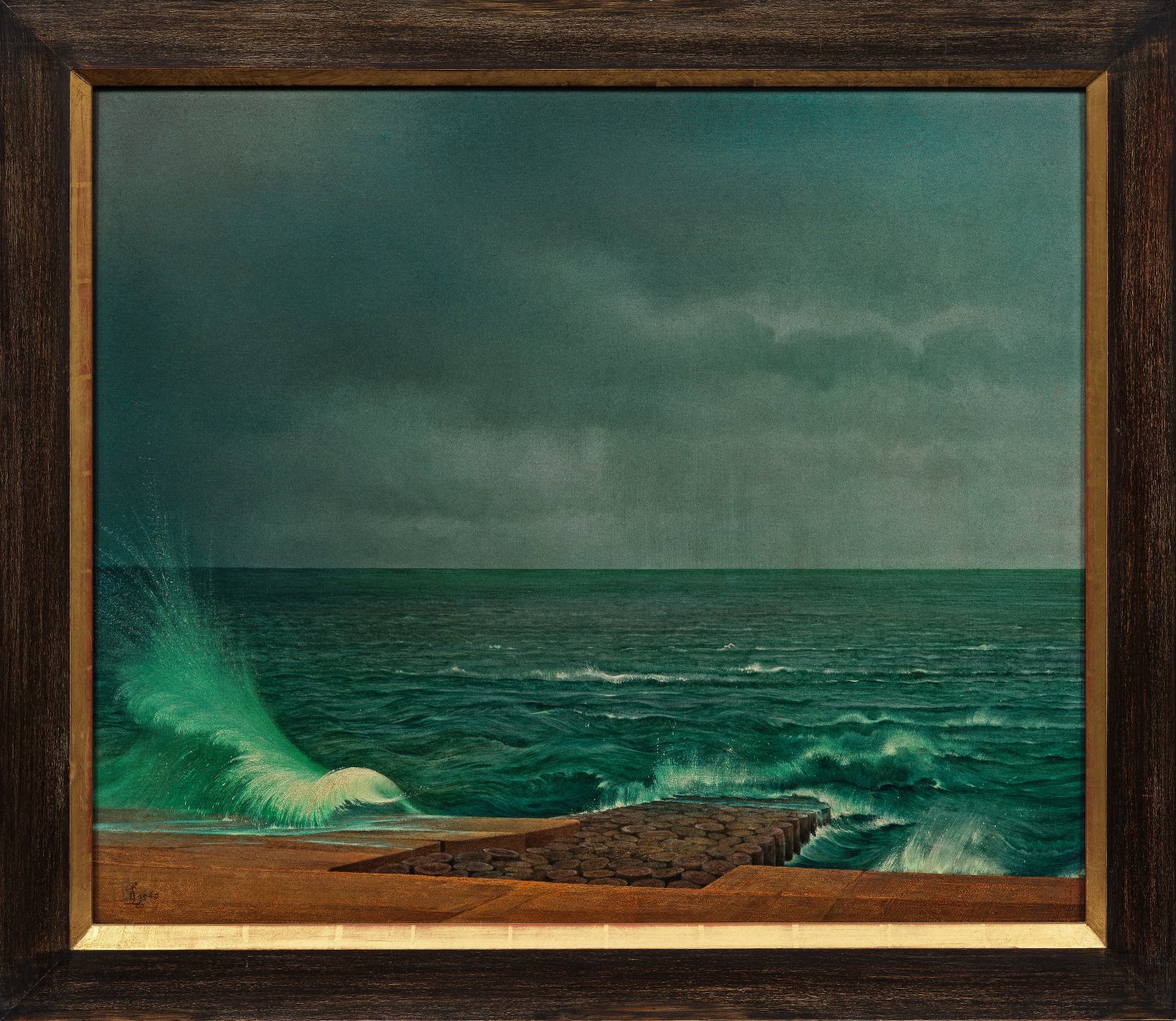 Landschaftsdarstellungen bilden eine bedeutende Gruppe im Werk Lenks, wobei er sich wie im vorliegenden, in feiner, teilw. lasierender Technik ausgeführtem Werk von 1945, als würdiger Nachfolger des Romantikers Caspar David Friedrich erweist, der ihn wesentlich inspiriert und beeinflusst haben dürfte. Der Blick des Betrachters führt über das befestigte Ufer und eine alte Slipanlage auf die unendlich scheinende Weite des Meeres, dessen Wellen heranrollen und sich in der Brandung ergießen. Lenk gehört neben Otto Dix, Alexander Kanoldt, Franz Radziwill und Georg Schrimpf zu den bedeutendsten Künstlern der Neuen Sachlichkeit in Deutschland. Er studierte 1915-1924 an der Dresdener Akademie bei Richard Müller, Ludwig von Hoffmann und Ferdinand Dorsch. Vermutlich kam er in dieser Zeit auch erstmals mit Werken von Otto Dix in Berührung, der in dieser Zeit ebenfalls an der Dresdner Akademie tätig ist und mit dem er später freundschaftlich verbunden ist. 1926 zog Lenk nach Berlin, wo er an den Vereinigten Staatsschulen für freie und angewandte Kunst lehrte, seit 1933 als Professor für Landschaftsmalerei. 1928 gründete Lenk mit Kanoldt und Radziwill die Künstlergruppe "Die Sieben" und begann mit der seinen Stil prägenden altmeisterlichen Technik in Öl-Tempera-Malerei. Lenk und der bereits verfemte Dix malten 1934 gemeinsam im Hegau und am Bodensee und stellten 1935 in der Berliner Galerie Nierendorf ihre Landschaften aus. 1936 wurde Lenk Vorstandsmitglied der Berliner Secession und 1937 Mitglied der Preußischen Akademie der Künste. 1937 verweigerte Lenk eine Beteiligung an der Großen Deutschen Kunstausstellung in München, setzte sich für verfolgte Kollegen ein und legte sein Lehramt an den Vereinigten Staatsschulen aus Protest gegen die Diffamierung von Kollegen und gegen die repressive "Kunstpolitik" im "Dritten Reich" nieder. In den folgenden Jahren reiste er zu Studienzwecken ins Vogtland, nach Thüringen, auf die Insel Amrum nach Schlesien sowie an den Bodensee und in den Hegau. Lenk zog sich 1938 nach Orlamünde in Thüringen zurück. 1944 zog er nach Wilhelmsdorf (Württemberg), später wohnte er in Großheppach, bis er 1948 in Fellbach ansässig wurde. 1950 erhielt er einen Lehrauftrag am Carnegie Institute in Pittsburgh (Vereinigte Staaten). 1959 ließ sich Lenk schließlich in Schwäbisch Hall nieder. Öl u. Eitempera/Lwd., alt auf Hartfaser kaschiert. L. u. Ligatur-Monogramm mit Dat. 1945. Verso Ausstellungs-Etikett der Galerie von Abercron, Köln, 1976 (siehe Lit.). 67,5 cm x 80,5 cm. Rahmen.