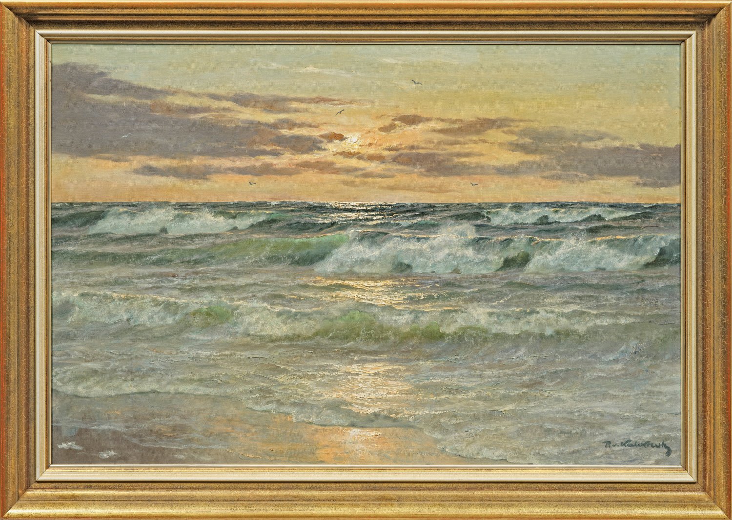 Charakteristisches, höchst stimmungsvolle Werk des bekannten Marinemalers, der zeitweilig in Düsseldorf und Berlin tätig war. Bekannt machten ihn besonders seine atmosphärischen Schilderungen der Nordsee, sowohl der gischtigen, teilw. vom Sturm bewegten Wellen auf hoher See als auch in der Uferzone, bei denen er virtuos das Meer und das Licht einfing. Öl/Lwd.; R. u. sign.; 60,5 cm x 91 cm. Rahmen.