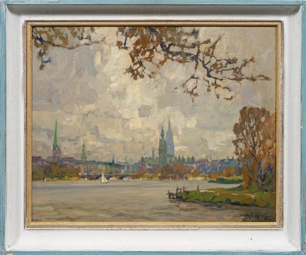 Unter grauen Wolken die herbstliche, durch Segler belebte Ansicht der Binnenalster mit Blick auf die Lombardsbrücke. Im Hintergrund erhebt sich die charakteristische Stadtsilhouette Hamburgs mit dem Rathaus und den Kirchtürmen der Innenstadt. Mit lockerem, breitem Pinselstrich und fein nuancierter Palette gemalte, unmittelbare, spätimpressionistische Vedute Merckers, der neben vielen Industriebildern eine Reihe imponierender Hamburgveduten und atmosphärischer Marinestücke schuf. Öl/Masonit. R. u. sign. mit Ortsangabe M(ün)ch(e)n. Verso auf Atelieretikett ortsbezeichnet "Alster". 39,8 cm x 49,8 cm. Rahmen.