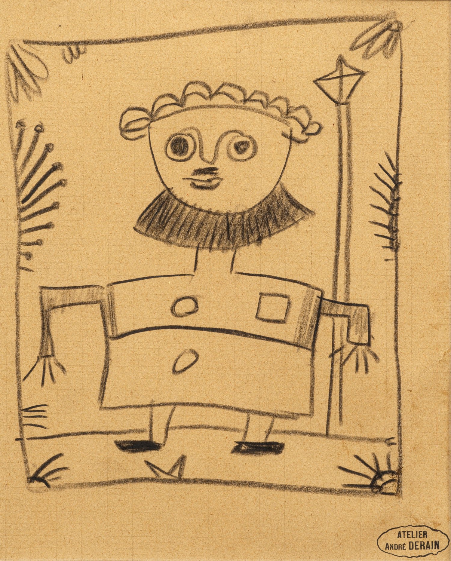 Mit wenigen Strichen die Figur umreißende Zeichnung des bedeutenden Fauvisten. Ein Jahr vor seinem Tod schuf Derain 1953 noch die Ausstattung, Bühnenbilder und Kostüme für die legendäre erste Aufführung des "Barbiers von Sevilla" auf dem berühmten Musikfestival von Aix-en-Provence. Bleistift/dünnes, fragiles, fein liniertes Papier. R. u. mit dem Atelierstempel "ATELIER ANDRÉ DERAIN" (Lugt 668a). Im ehemaligen Passepartoutausschnitt gebräunt; restaurierter Riss in der rechten unteren Ecke. Blatt 21,9 cm x 17,6 cm. Rahmen.