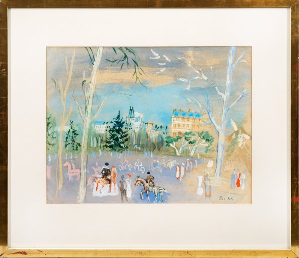 Blick auf einen belebten Park mit Reitern, Radfahrern, Spaziergängern und Kutsche, wohl der Bois de Boulogne, im Hintergrund eine umgebende Häuserreihe. Wohl um 1950 geschaffenes Werk Dufys, der wesentlich durch den Fauvismus und Matisse beeinflusst wurde. Jean Dufy war der jüngere Bruder des bekannten Fauvisten Raoul Dufy (1877 - 1953), was ihm in seinem Entschluss bestärkt haben dürfte, sich nach kaufmännischer Ausbildung und Militärdienst der Malerei zuzuwenden. 1912 zog Jean Dufy nach Paris und begegnete dort rasch André Derain, Georges Braque, Pablo Picasso und dem bedeutenden Dichter und Schriftsteller Guillaume Apollinaire. Bereits 1914 präsentierte Dufy erstmals seine Aquarelle in der "Galerie Berthe Weill" in Paris und fand große Anerkennung, 1920-1938 beteiligte sich Jean Dufy an einer Reihe von Ausstellungen in Paris und New York. 1937 führte er zusammen mit seinem Bruder Raoul ein monumentales Deckenfresko für die Weltausstellung aus. Paris war sein bevorzugtes Thema, das ihn zu zahlreichen Ölbildern, Aquarellen und Grafiken inspirierte. In heiterer Bildsprache und in hellem, teilw. leuchtendem Kolorit malte Dufy die belebten Straßen, Plätze, Parks, den Eiffelturm, die Seine, Notre Dame, Montmartre und Sacre Coeur. Aquarell u. Gouache/Papier. R. u. sign.; 43 cm x 56,5 cm (Passepartoutausschnitt). Rahmen.
