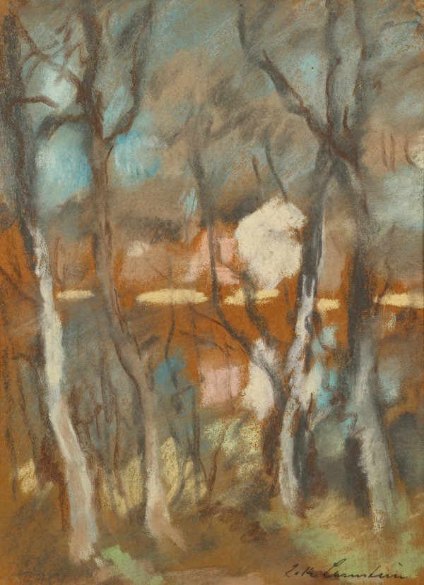 In breiten, dynamischen Strichen angelegte Landschaftsschilderung Lasersteins, verbunden mit Stilelementen des Im- und Expressionismus, vermutlich entstanden in den 1960/1970er Jahren. Das Motiv scheint aus der unmittelbaren Umgebung der Künstlerin entlehnt, die 1952 ein Sommerhaus auf Öland erwarb und 1954 von Stockholm aufs Land nach Kalmar zog. Lotte Laserstein erhielt ihre Ausbildung in den 1920er Jahren in Berlin, wo ihr Werk - besonders ihre Bildnisse im Stil der Neuen Sachlichkeit - rasch große Anerkennung erfuhr. 1937 emigrierte sie nach Schweden, um den Gefahren zu entfliehen, die ihr aufgrund ihrer jüdischen Abstammung von dem nationalsozialistischen Regime drohten. Ab 1987 wurde ihr Oeuvre in Retrospektiven in London, Schweden und Berlin wiederentdeckt. Die Nationalgalerie in Berlin und das Städel-Museum in Frankfurt erwarben frühe Hauptwerke. 2018/19 fanden ebenfalls große Retrospektiven statt. Pastell/bräunliches Papier. R. u. mit Bleistift sign.; 29,8 cm x 21 cm. Rahmen.