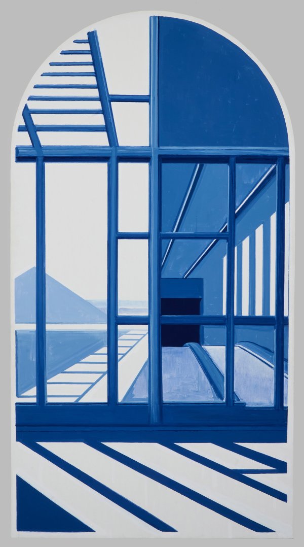 In blauen und violetten Tönen ausgeführte, großformatige Arbeit Neris, der in der zweiten Hälfte der 1990er Jahre begann, Architekturmotive und Landschaften zu malen. 1999 entstand seine Fensterserie "Windows" als Gemäldeserie und Installation, die Harald Szeemann dazu veranlasste Neri zur 49. Biennale von Venedig 2001 einzuladen, wo er an zentraler Stelle im italienischen Pavillon ausstellte. Acryl oder Tempera/Lwd.; Verso sign., betitelt u. dat. 2002. Ca. 250 cm x 137 cm.