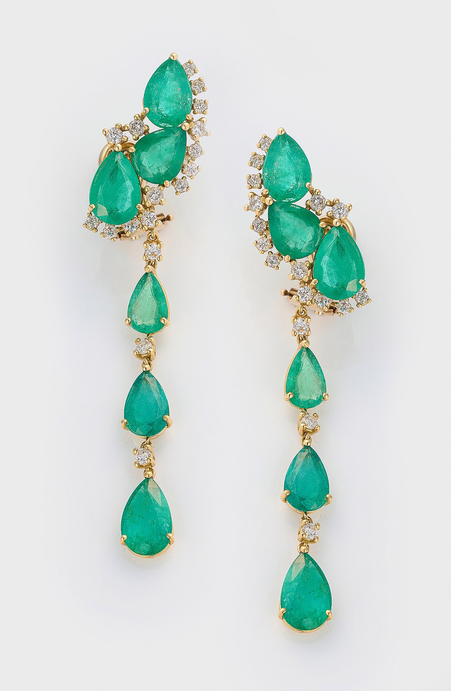 Gelbgold, gest. 750. Schauseitig besetzt mit Smaragdtropfen von zus. 17,65 ct. in Minorqualität, akzentuiert durch Brillanten von zus. ca. 0,70 ct.; Ges.-Gew. ca. 13,21 g.