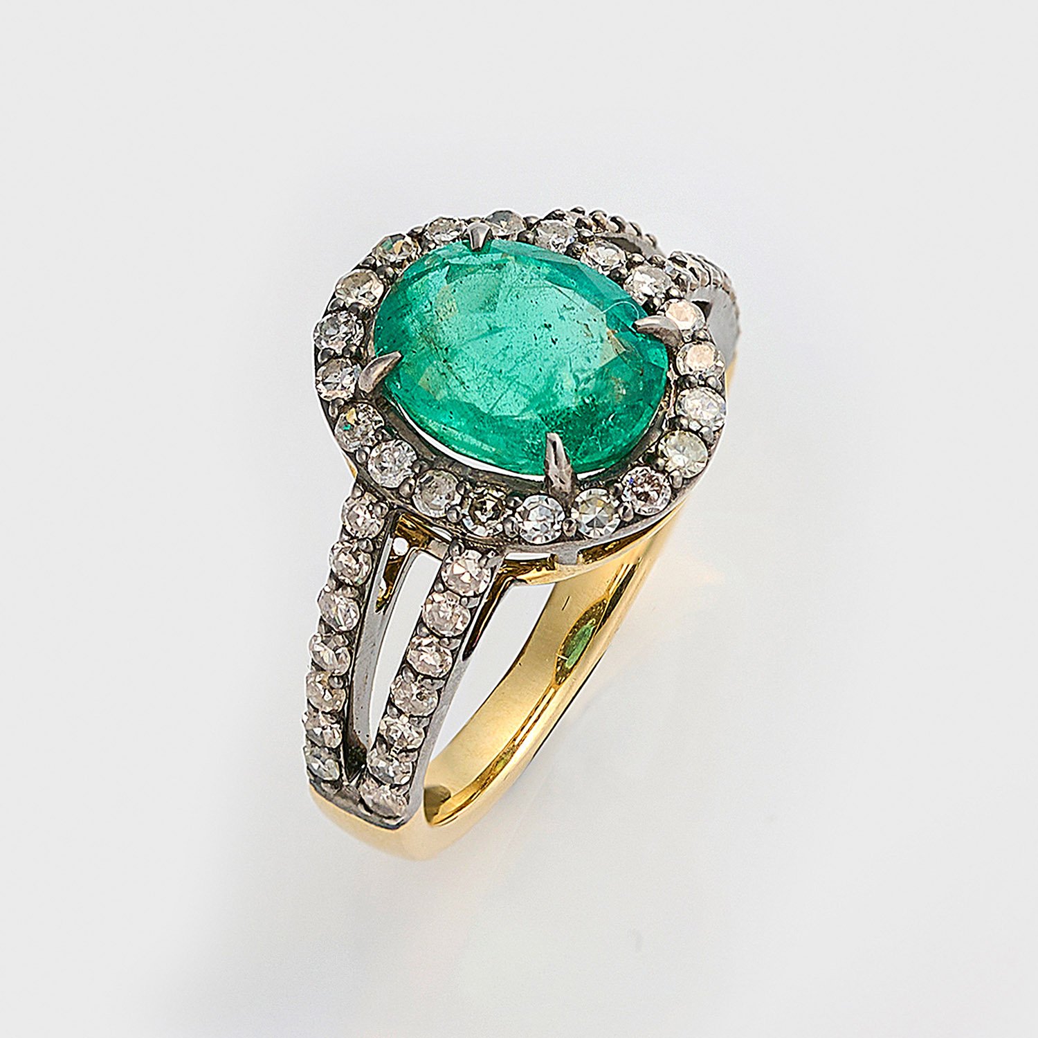 Gelbgold, teilw. mit Silber verbödet, gest. 56 (583). Zentral besetzt mit einem Smaragd von ca. 2,40 ct., entouriert von Diamanten von zus. ca. 0,70 ct.; Gew. ca. 3,90 g.
