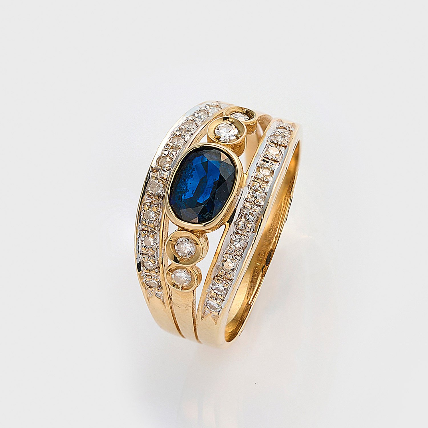 Gelbgold, gest. 585. Zentral besetzt mit einem tintenblauen Saphir von ca. 0,70 ct. und Brillanten von zus. ca. 0,20 ct.; Gew. ca. 4,32 g.