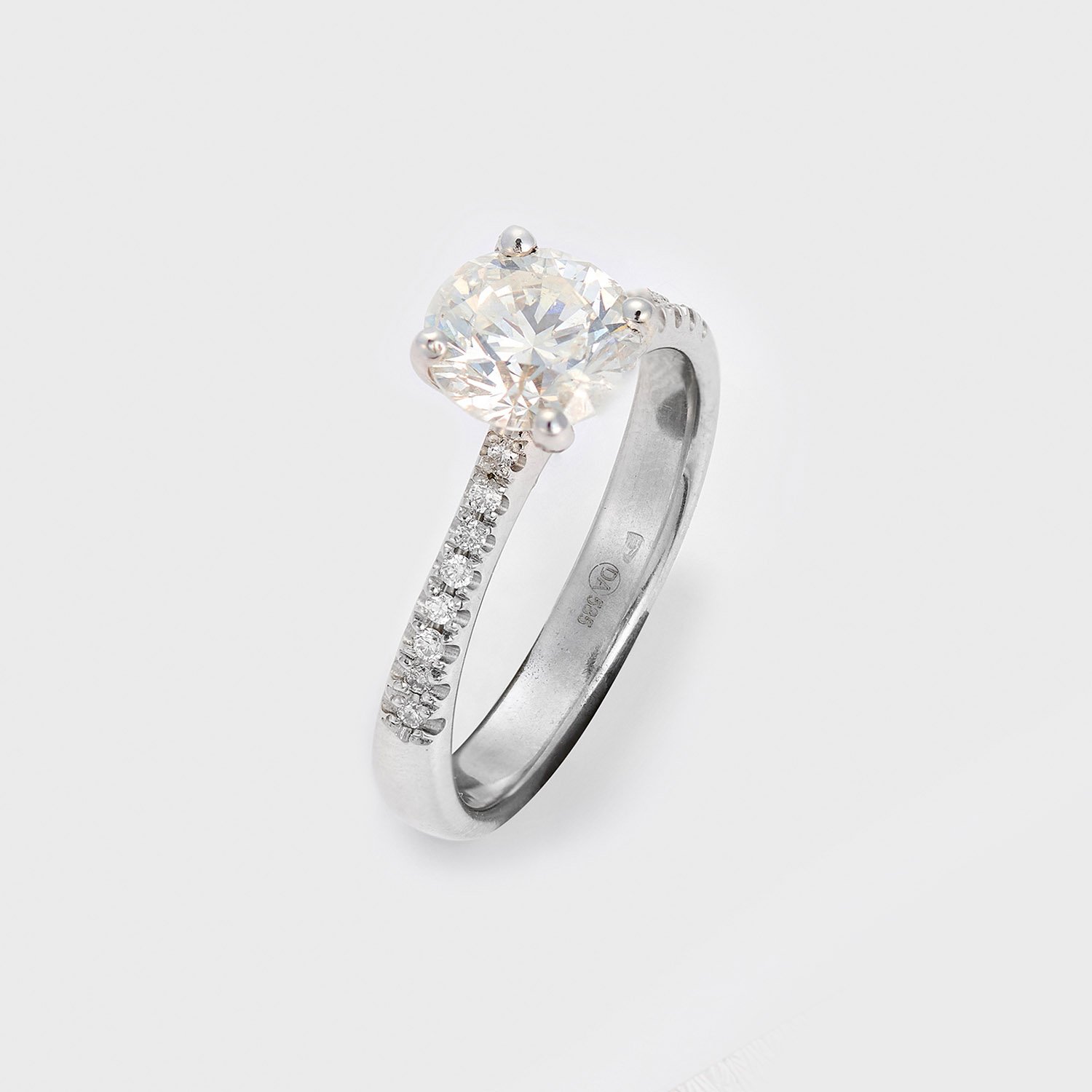 Ring set with a brilliant solitaire approx. 1,45 ct. (F/si) and small diamonds approx. 0,10 ct., in 14 k white gold. Certificate included.